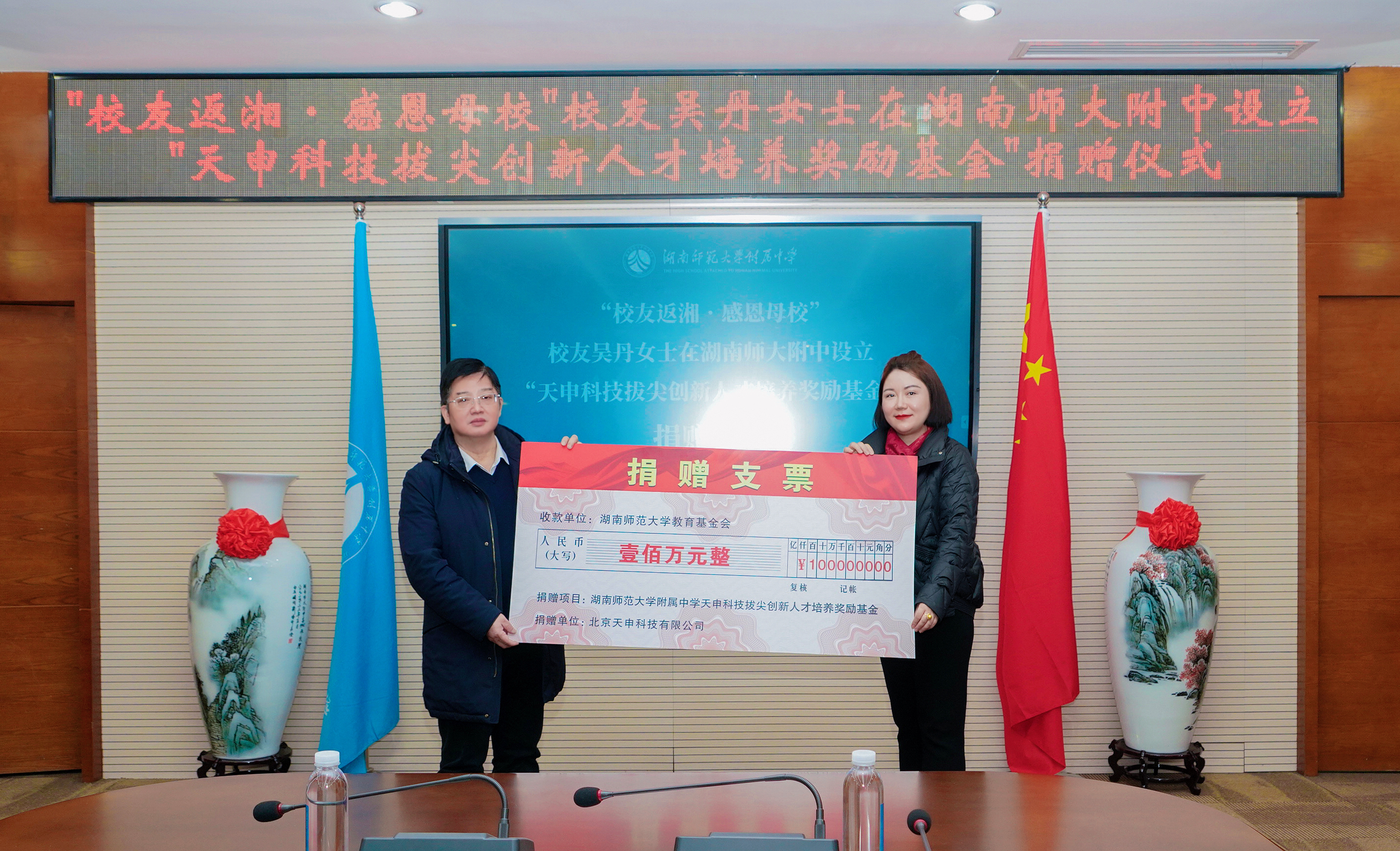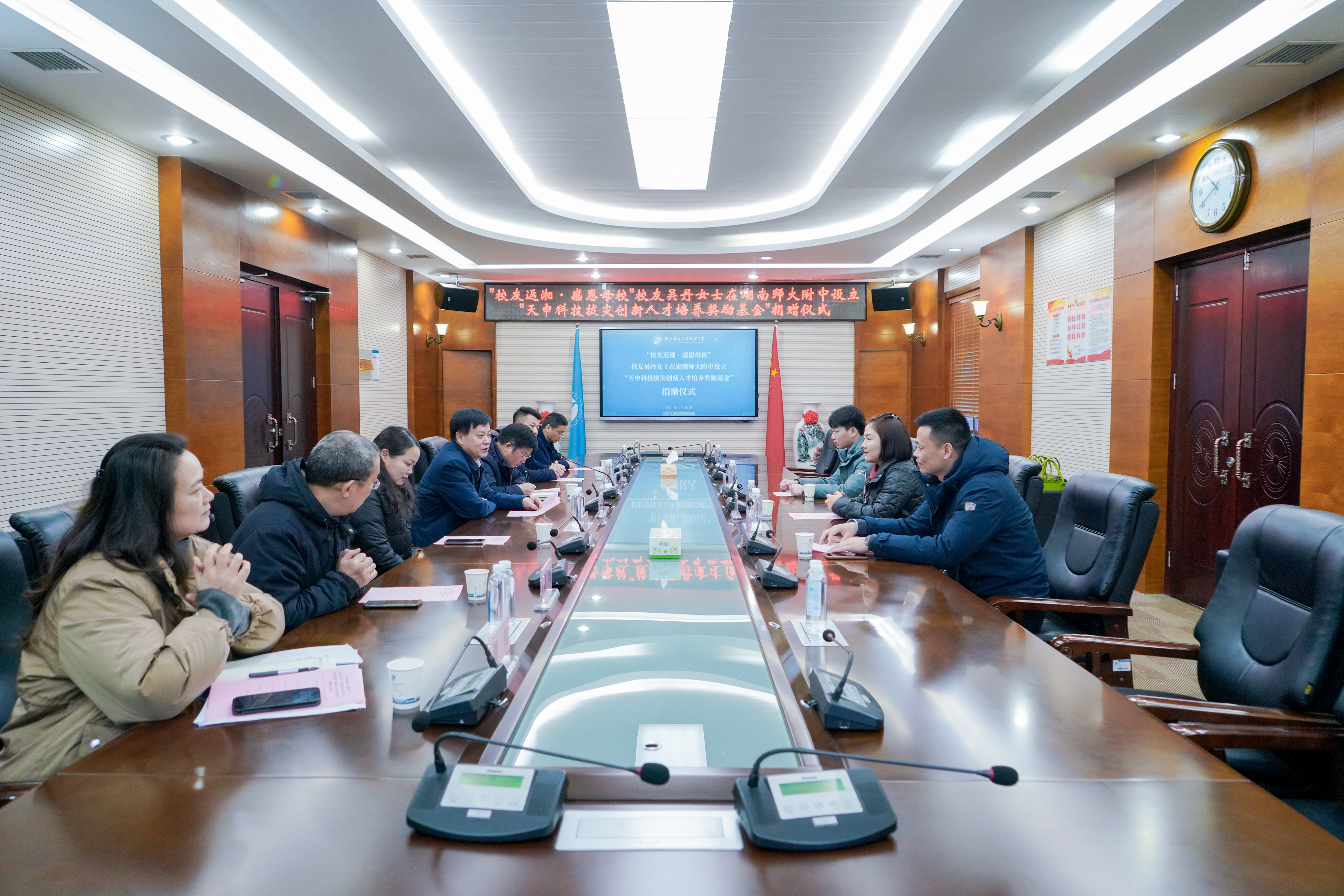2月26日,为积极响应湖南省委省政府“校友回湘”的号召,2000级北京校友吴丹女士向湖南师大附中捐赠设立“天申科技拔尖创新人才培养奖励基金”捐赠仪式在校史馆会议室举行。