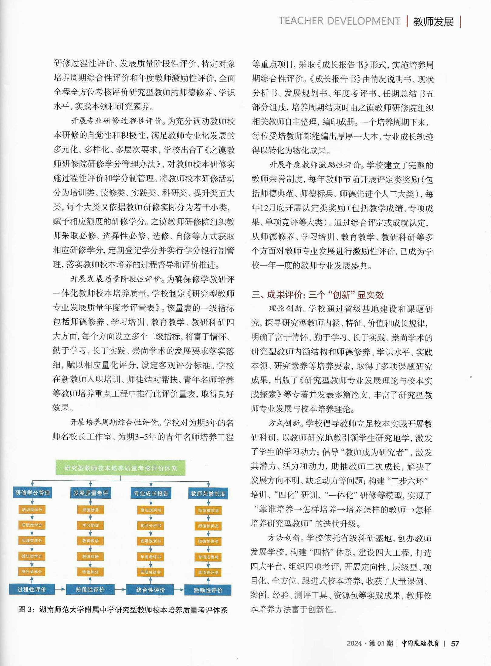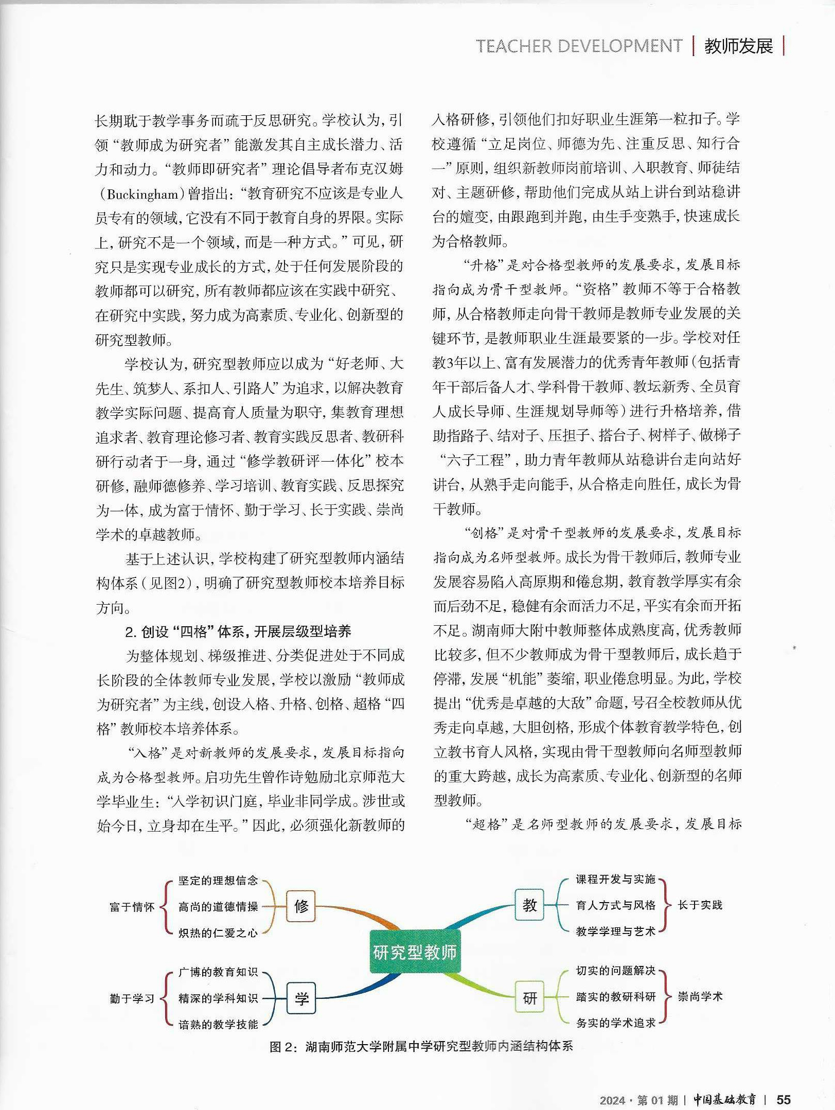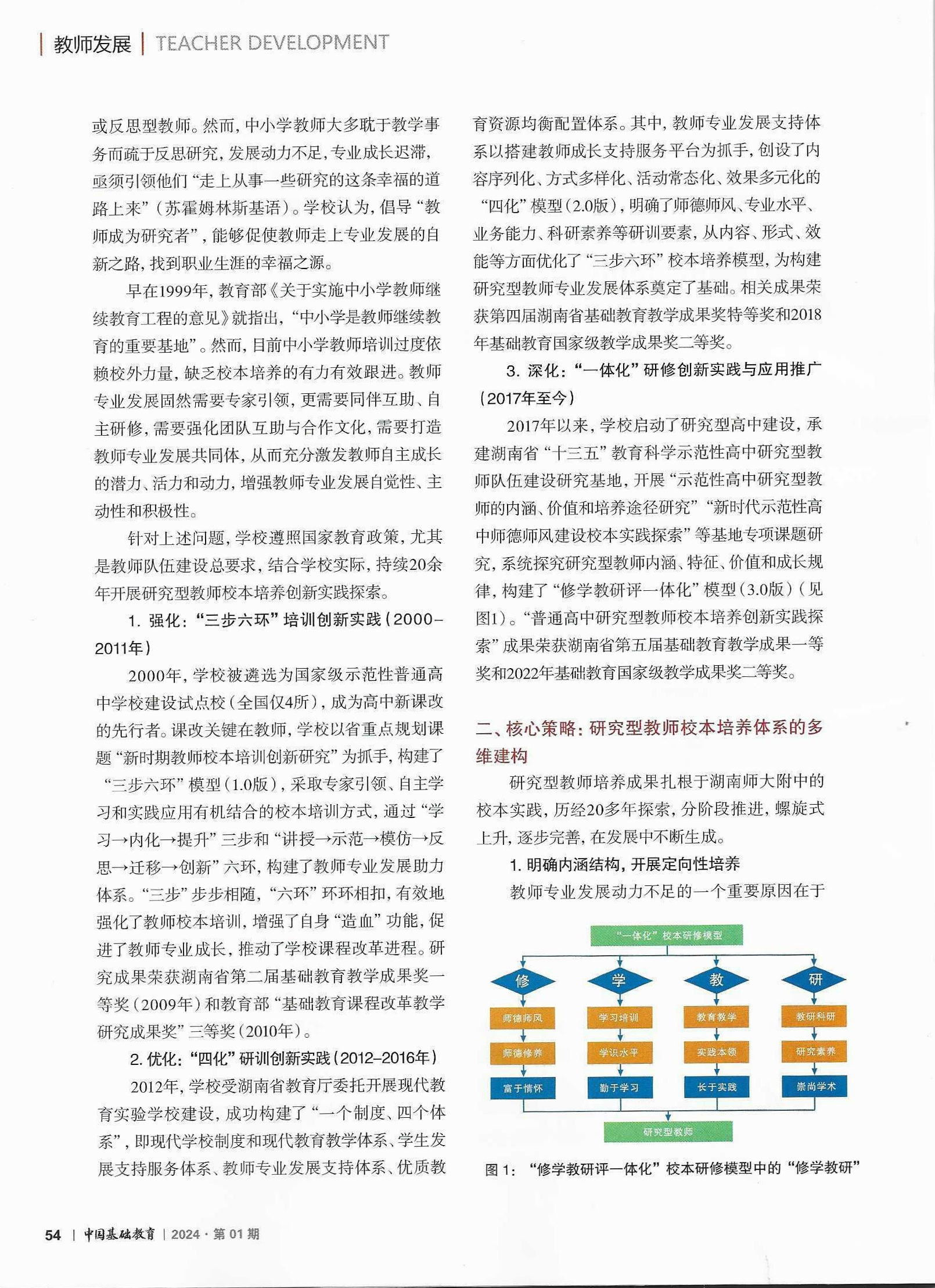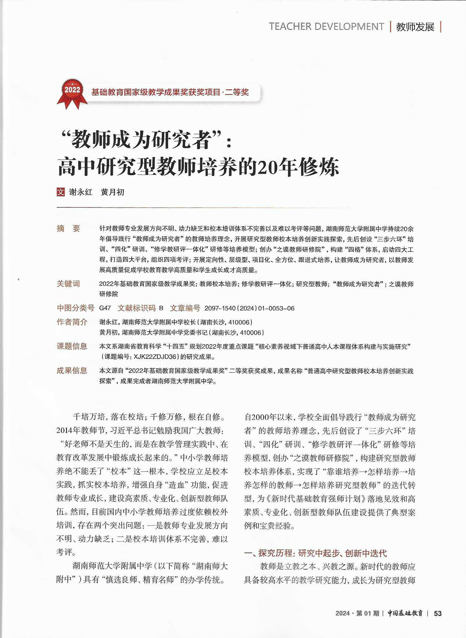近日,由中华人民共和国教育部主管,中国教育学会主办的专业期刊《中国基础教育》2024年第1期刊发我校校长谢永红、党委书记黄月初的署名文章《“教师成为研究者”:高中研究型教师培养的20年修炼》。