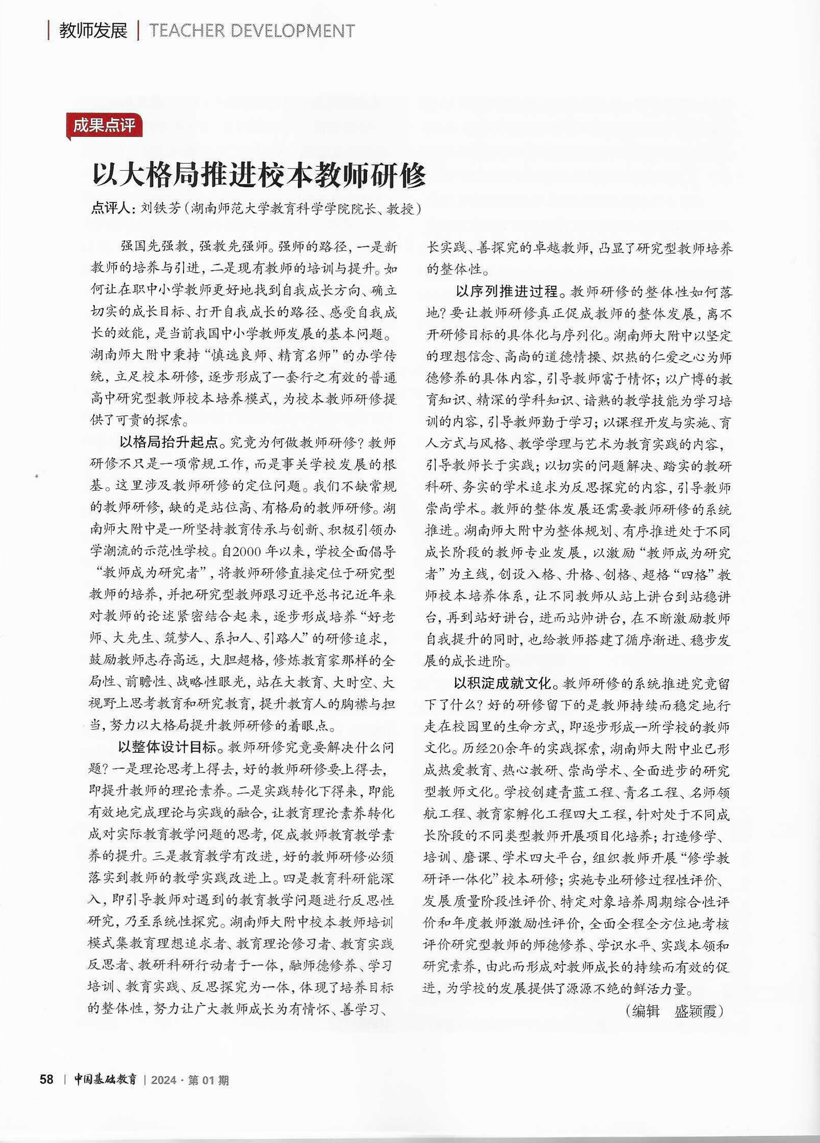 我校注重教育科研,以“科研兴校,全面育人”为管理特色,以科研促进教学、教学带动科研,近年来成果丰硕。《中国基础教育》2024年第一期的重点推荐,充分显示我校教育科研已成为全国教育改革发展的重要力量和支撑。