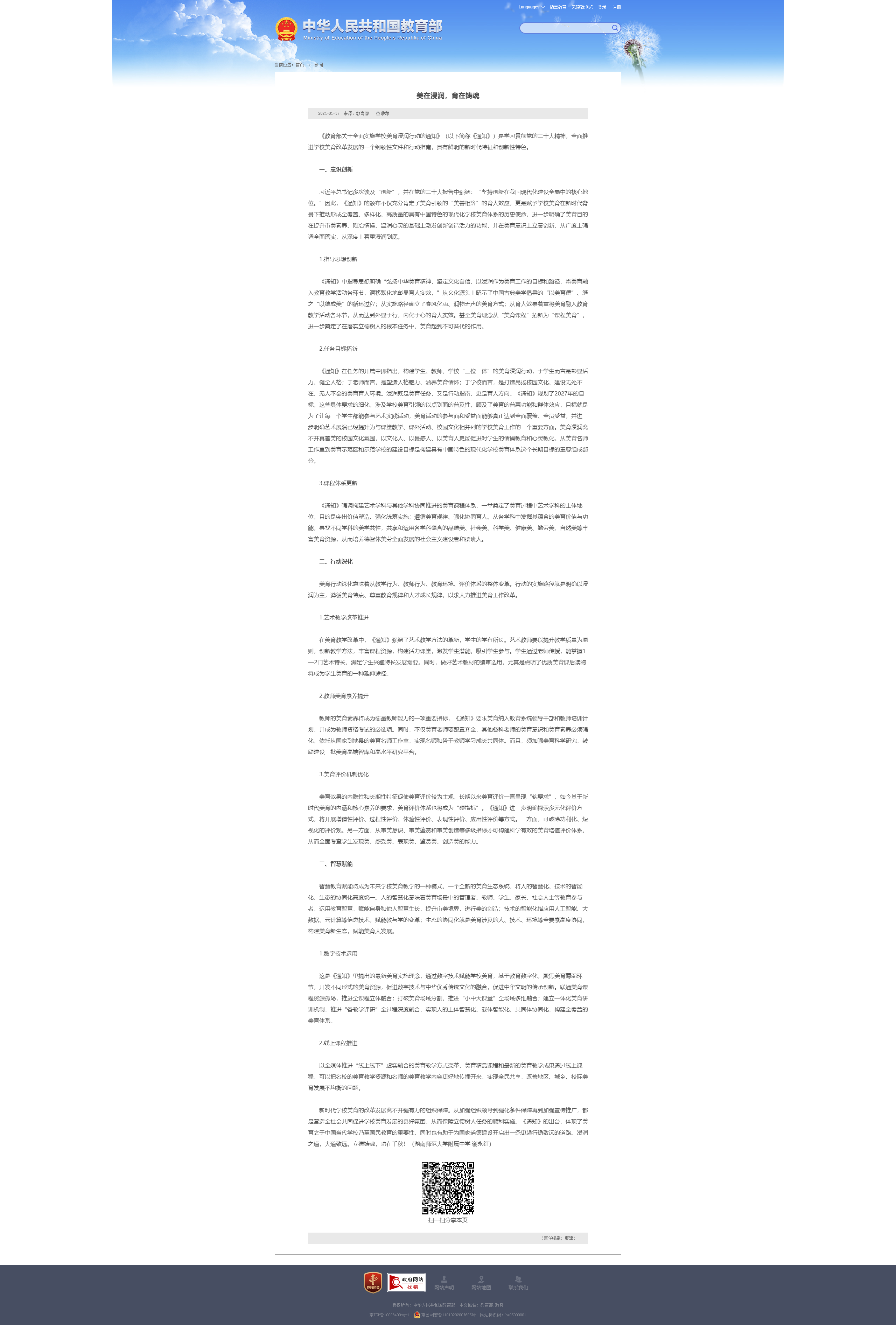 教育部政府门户网站登载谢永红署名文章:美在浸润,育在铸魂
