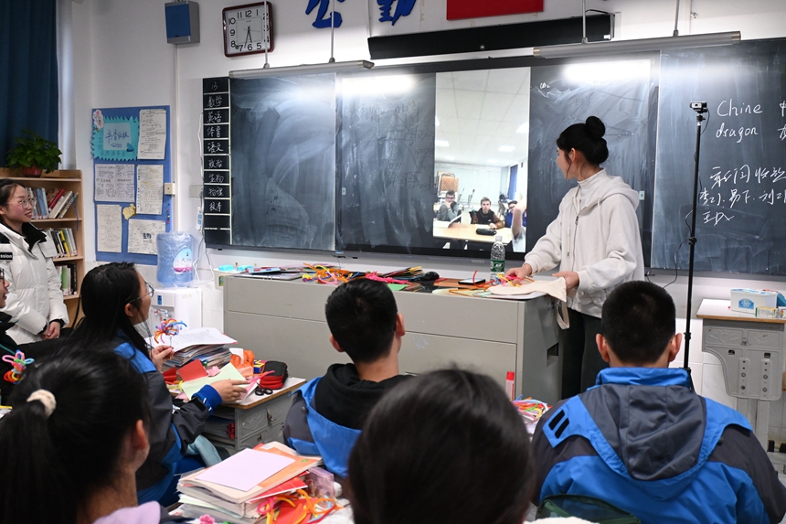 法语课上,老师组织学生学习剪窗花、做扭扭棒等手工小物件。双方学生相互热情打招呼、彼此进行介绍。书到用时方恨少,学生在应用中更加发现要多积累学习,才能与外国友人更深入地交流。