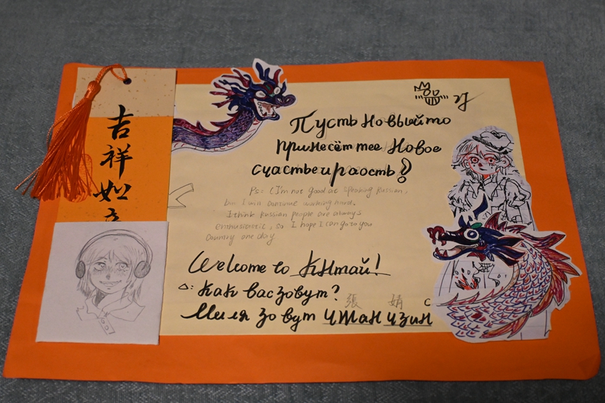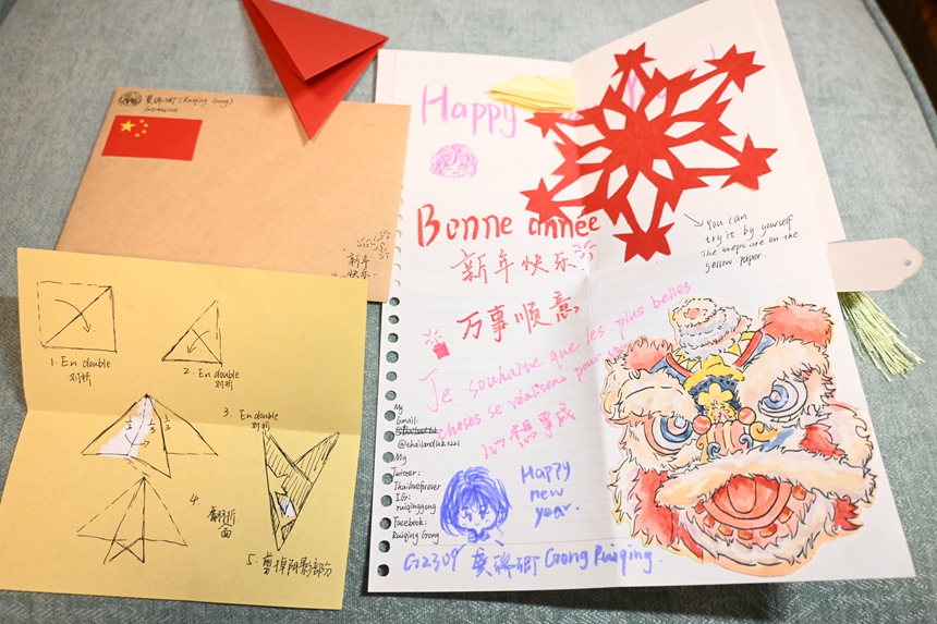 俄语班和法语班的学生在之前的课上,还学习了祝福话语的表达,并在老师的指导下,制作了超级精美且创意满满的手工贺卡。他们的美好祝福将漂洋过海,送达到友好校学生的手上。