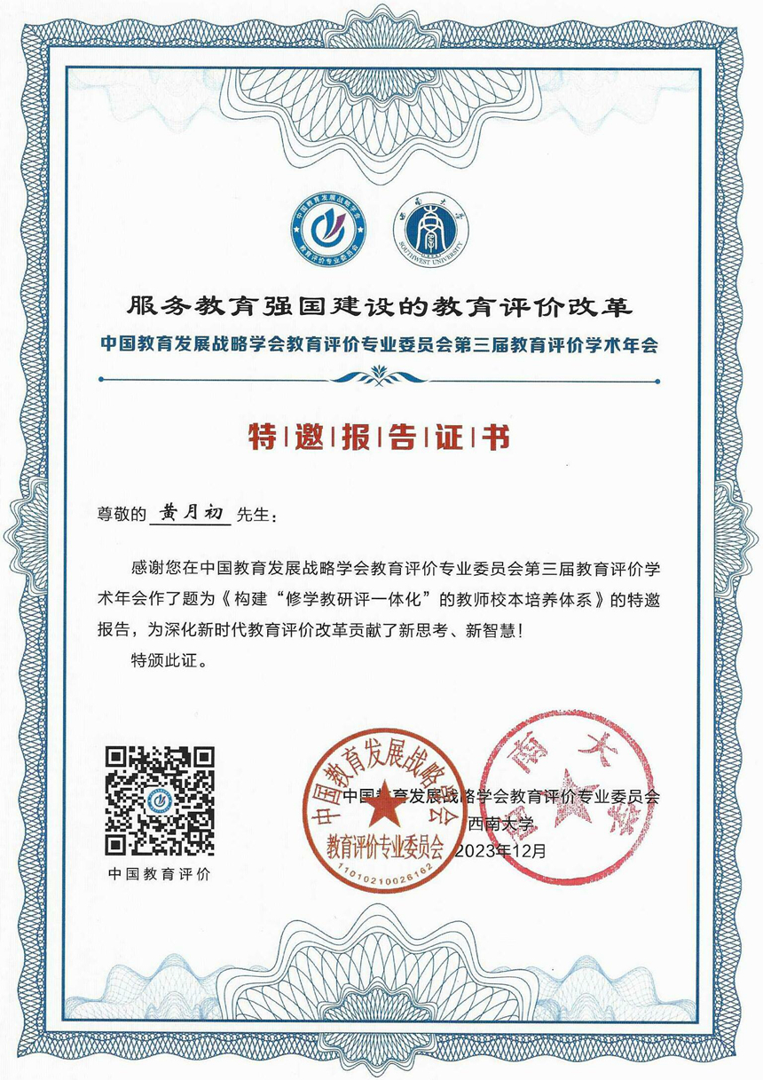 12月8-10日,以“服务教育强国建设的教育评价改革”为主题的第三届教育评价学术年会在重庆举办。我校党委书记黄月初受邀出席并以《构建“修学教研评一体化”的教师校本培养体系》为题作学术报告。