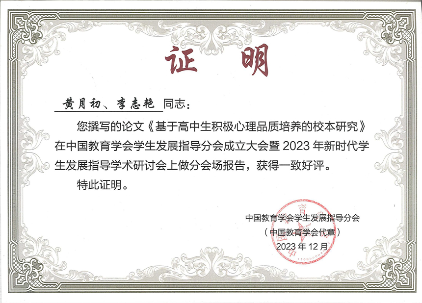 12月14日-16日,2023年新时代学生发展指导学术研讨会在北京举办。研讨会是中国教育学会学生发展指导分会成立后的第一次重要会议。我校党委书记黄月初参会并作《基于高中生积极心理品质培养的校本研究》学术报告。