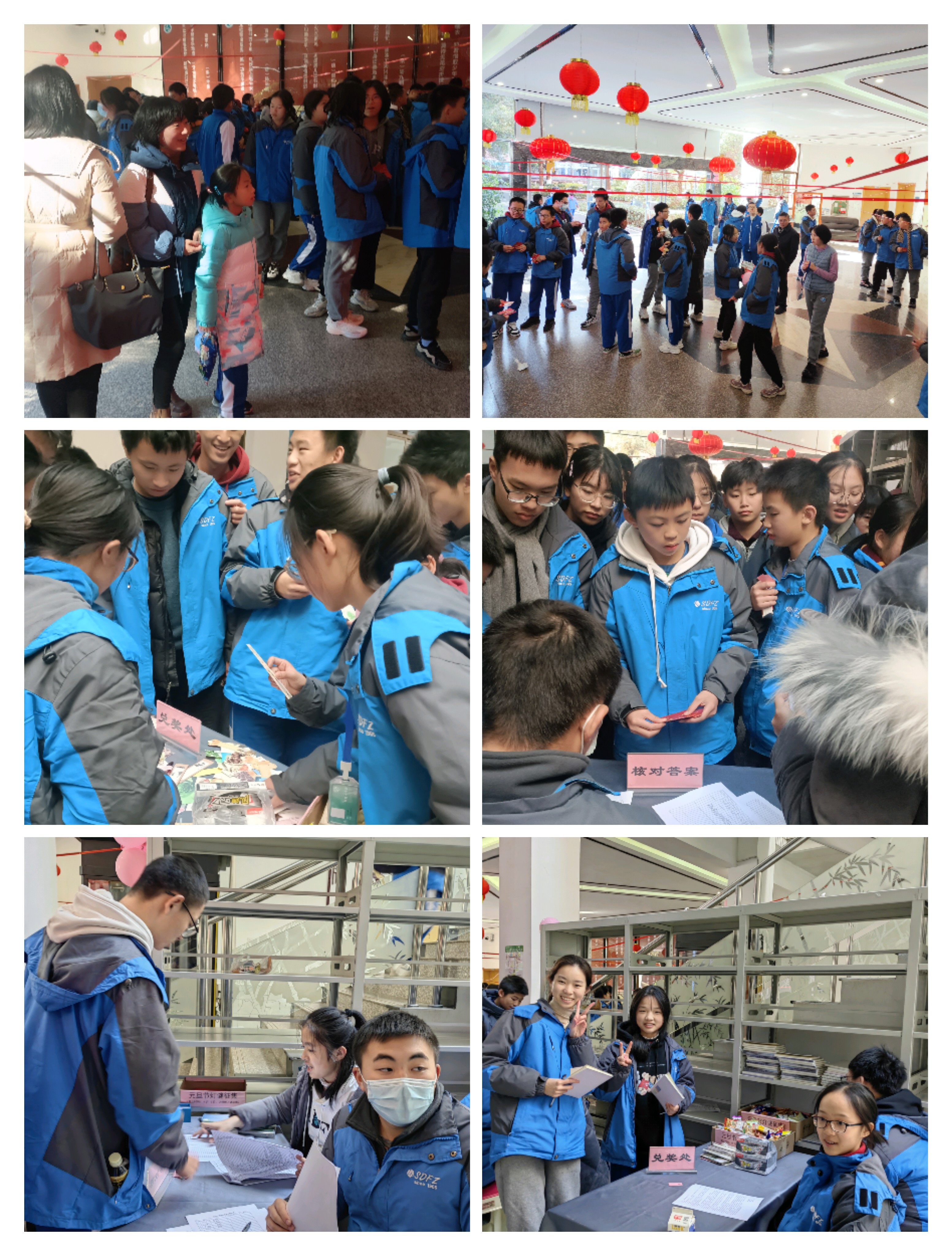 22日中午,图书馆热闹非凡,暖意洋洋。喜庆的红灯笼高高悬挂,红线绳挂满灯谜卡片。同学们踊跃参与,人头攒动,摩肩接踵,20分钟内灯谜卡片被一扫而空。同学们沉浸在猜谜的乐趣中,或对灯谜凝思苦想,或一起讨论灯谜答案,或胸有成竹地核对答案,或笑意盎然地兑换奖品。在图书馆老师们的带领下学生志愿者积极维持秩序。