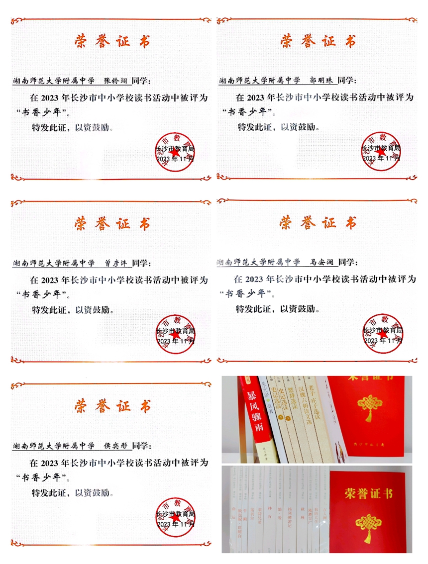 近日,我校参加长沙市教育局组织开展的长沙市中小学校读书活动荣获多个奖项。高一年级2313班被评为“长沙市书香班级”,班主任李云虎老师应邀参加了颁奖仪式。侯奕彤、曾彦沣、马安澜、郭明珠、张铃翊等五位同学荣获“长沙市书香少年”称号,并获得了长沙市教育局颁发的读书活动奖品优秀读本若干册。谨此向各位获奖班级及师生表示祝贺!