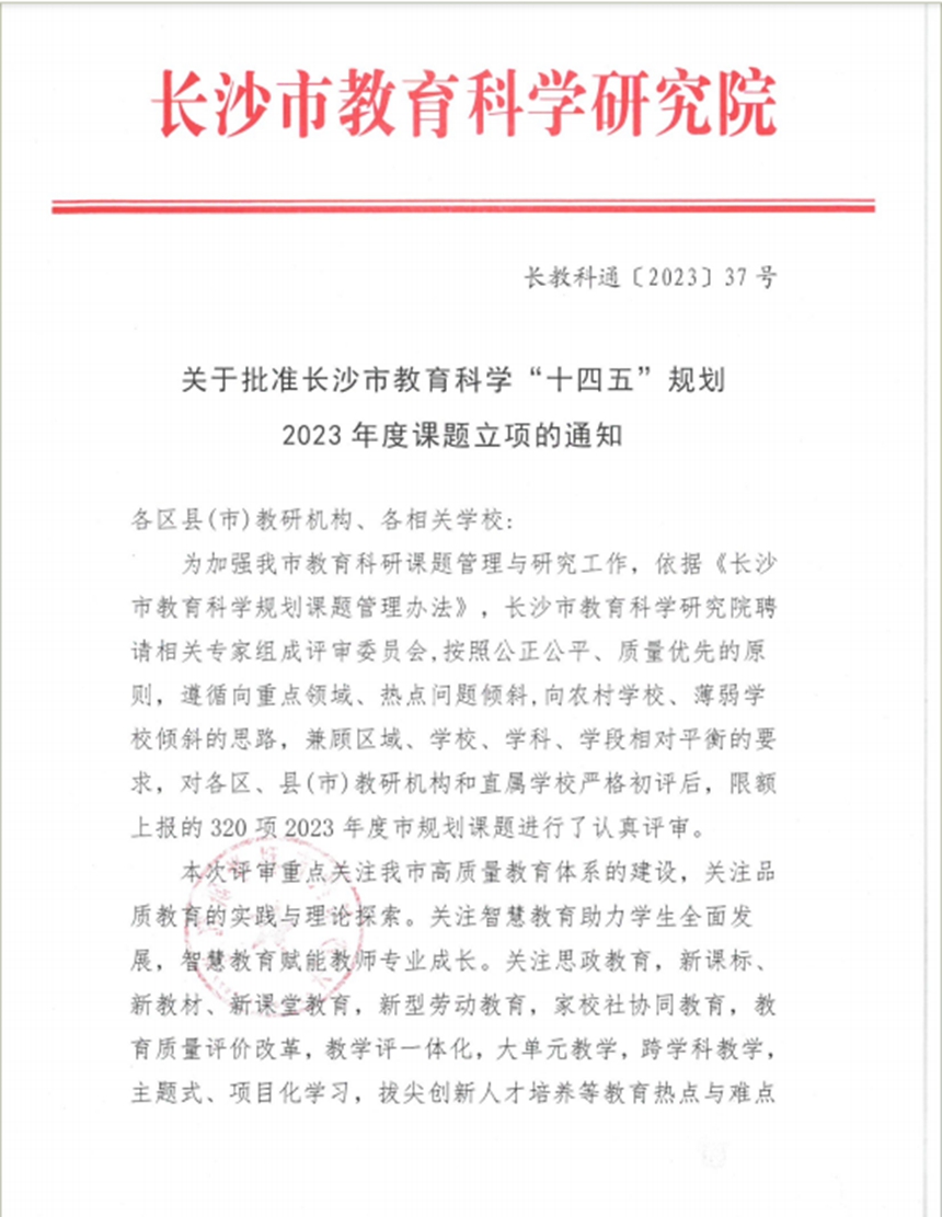 近日,长沙市教育科学研究院下达了《关于批准长沙市教育科学“十四五”规划2023年度课题立项的通知》(长教科通[2023]37号),化学组教师蒋艳云主持的课题《认知诊断视角下指向学习进阶的高中化学概念教学研究》获准立项为重点资助课题。