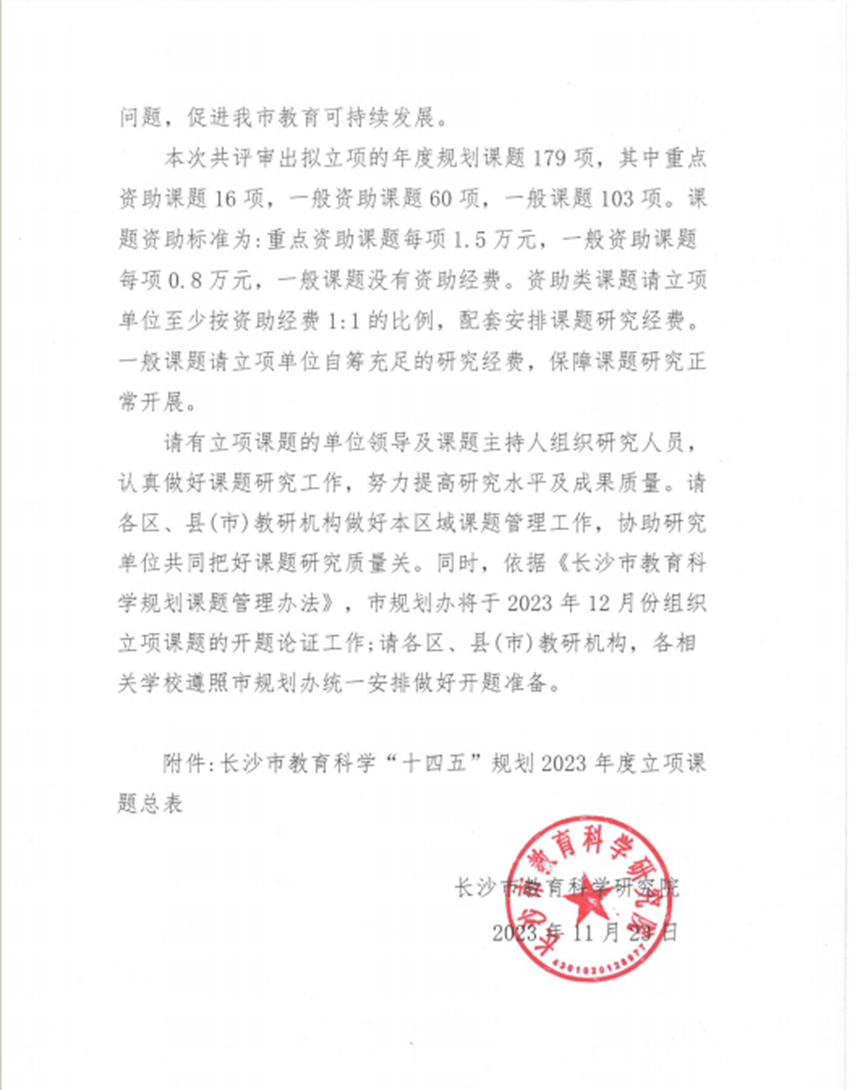 我校化学组课题获准立项为长沙市教育科学“十四五”规划 2023年度重点资助课题