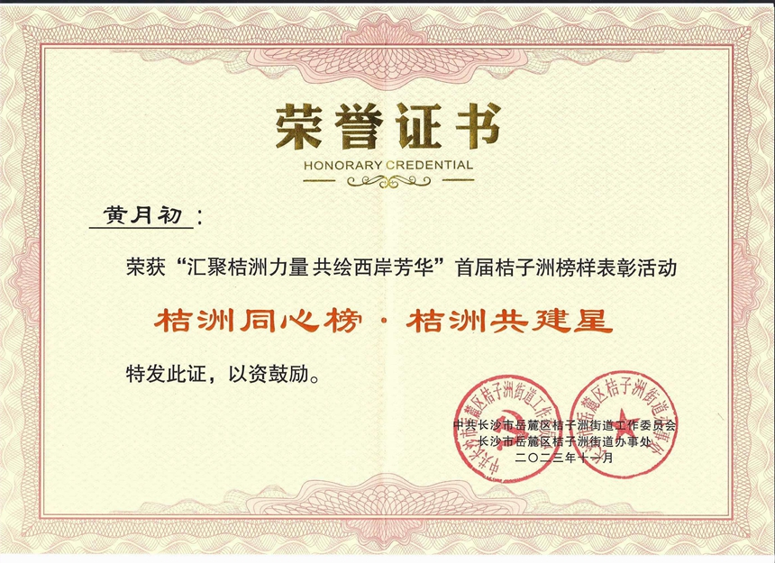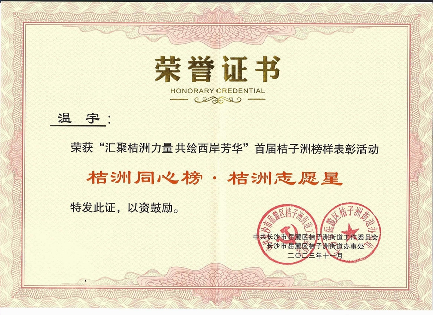11月16日上午,“汇聚桔洲力量 共绘西岸芳华”首届桔子洲榜样表彰活动举行。我校党委书记黄月初荣获桔洲共建星,团委书记温宇荣获桔洲志愿星。全国时代楷模段江华、中国好人李良义为10位“桔洲榜样”捧上奖杯;湖南湘江新区党工委委员、党政综合部部长杨中建,湖南湘江新区宣传工作部部长、岳麓区委常委、宣传部长刘雄辉,岳麓山大学科技城党工委书记罗予武等出席。
