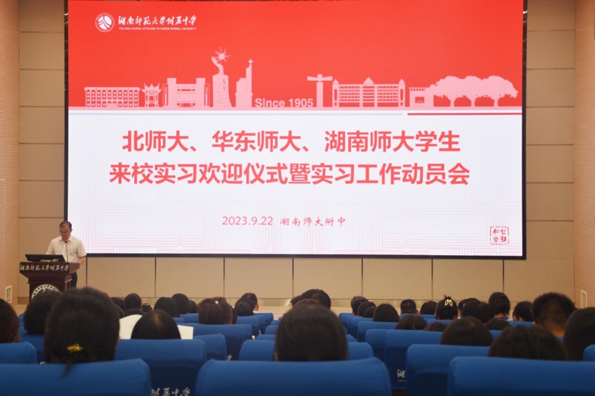 华东师范大学带队老师景培书和湖南师范大学带队老师彦中玉代表实习队指导老师发表讲话。景培书感谢附中对师范生培养的支持,表示会全力配合附中和指导老师的工作,并对实习老师提出了要求。彦中玉感谢附中为湖师大吸引了大批优秀人才,并希望实习老师高度自律、善于总结反思、虚心向兄弟院校实习老师学习。