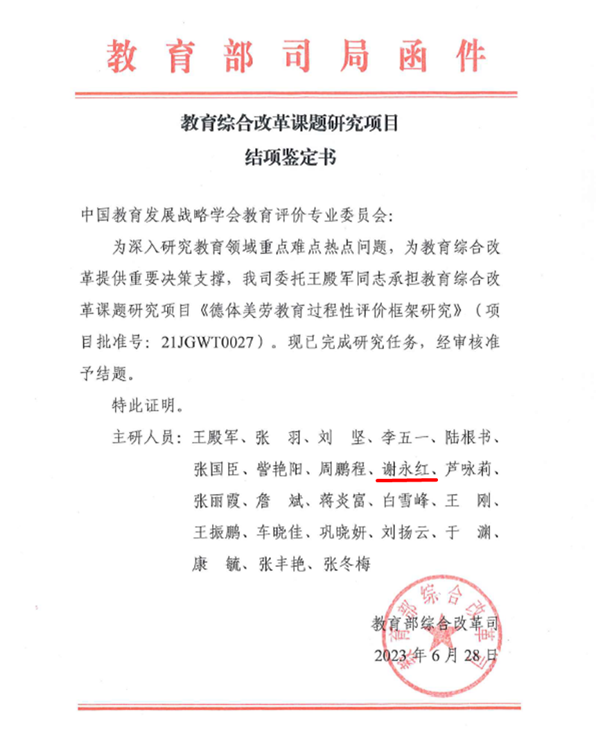 6月28日,教育部综合改革司下发《教育综合改革课题研究项目结项鉴定书》,我校参与研究的教育部重大委托课题《德体美劳教育过程性评价框架研究》(项目批准号:21JGWT0027)顺利完成研究任务,准予结题。