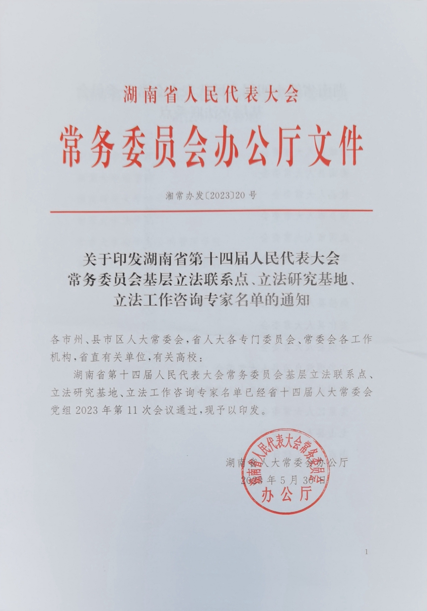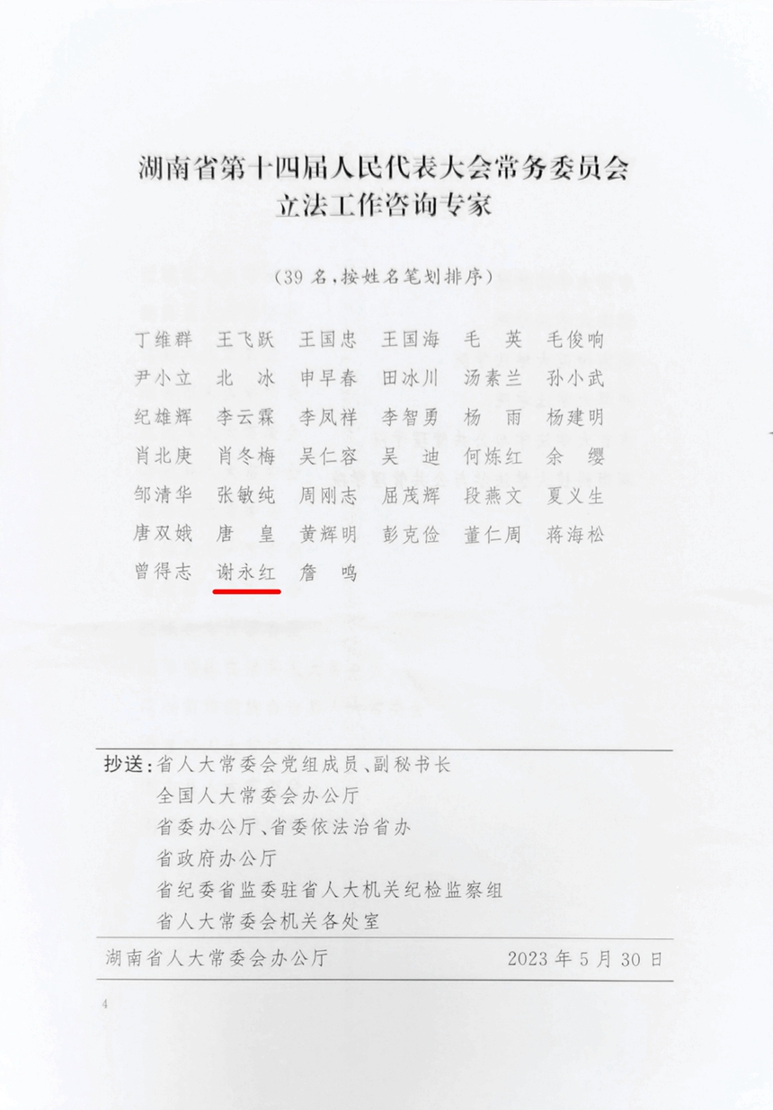 近日,接湖南省人大常委会办公厅通知,我校校长谢永红被聘为湖南省第十四届人大常委会立法工作咨询专家(全省共39名)。