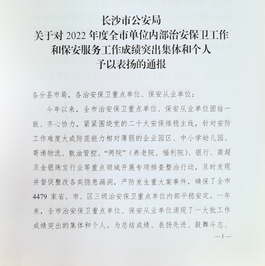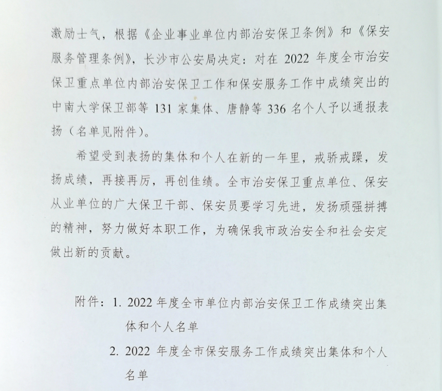 近日,长沙市公安局印发通报《关于对2022年度全市单位内部治安保卫工作和保安服务工作成绩突出集体和个人予以表扬的通报》,我校校长谢永红荣获成绩突出个人。
