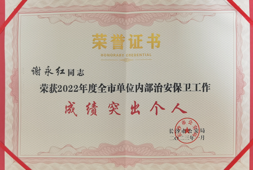 谢永红荣获2022年度长沙市单位内部治安保卫工作成绩突出个人