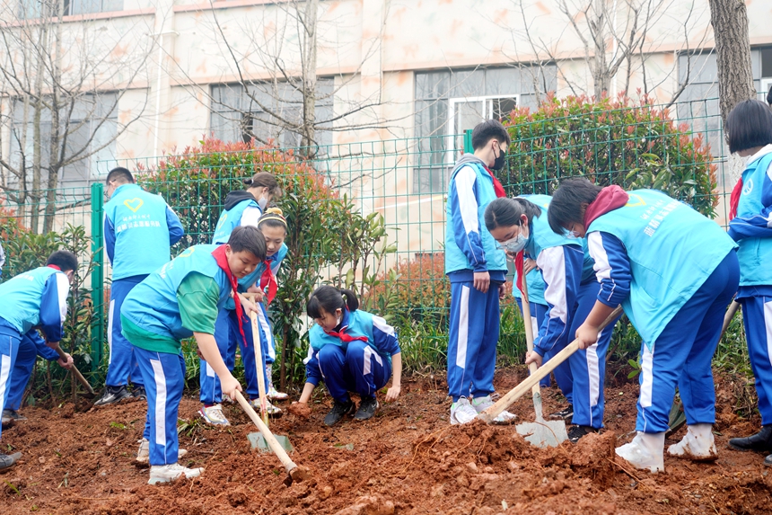 “在植树过程中,我与伙伴们一起扶苗、培土、压实,虽然又热又累但是看到一颗颗树苗迎风飘扬,我觉得很有成就感。”少先队员肖康睿说到。
