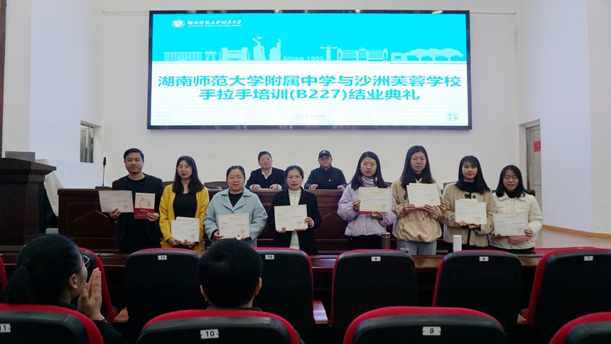 三个课程模块结束后,举行了结业典礼。科研与教师发展处主任刘进球作了B227项目实施小结,陈胸怀宣读了优秀学员表彰决定,沙洲芙蓉学校校长钟华平表示了感谢并表达了感想,我校党委书记黄月初作了总结讲话,他点评了国培团队的表现,点赞了沙洲芙蓉的配合与参与,强调了手拉手培训的意义和价值。