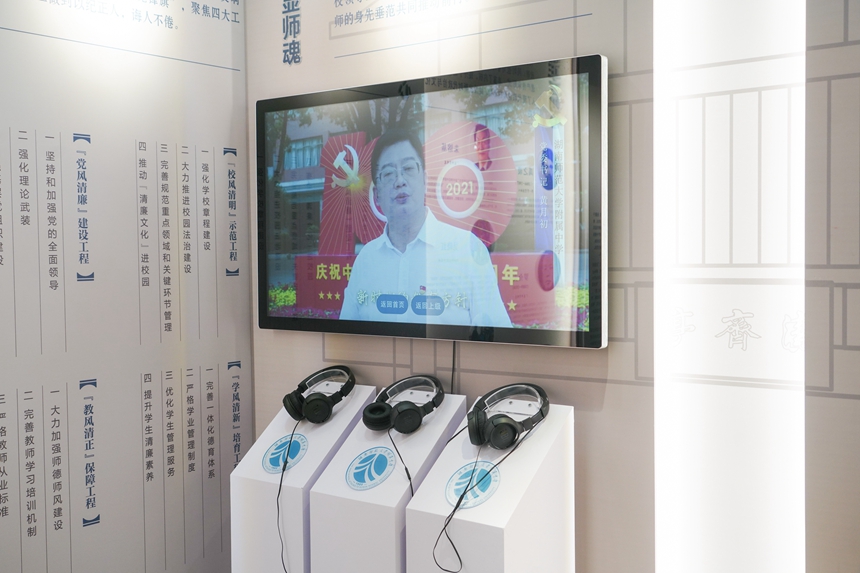 洁齐亭是附中校园一处清廉文化建设标识,也是我校清廉校园建设七色打卡点之一。在本次展览中,把校园中人人知晓的“洁齐亭”作为主题,原样复刻到展厅现场,是希望以此能够最真实、全方位地呈现我校脚踏实地,一心一意地践行着清廉校园“十个一“建设。“洁齐亭”展厅共分为清正立初心、清廉铸丹心、清净显师魂,清扬育群英四大板块,暗合校训“公勤仁勇”,紧扣“五清五育”,充分发掘了附中117周年校史中的红色基因,用他们的优秀精神品质,激励着附中人在学校发展和清廉建设中不断前行。