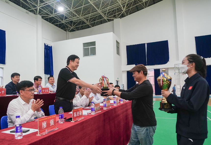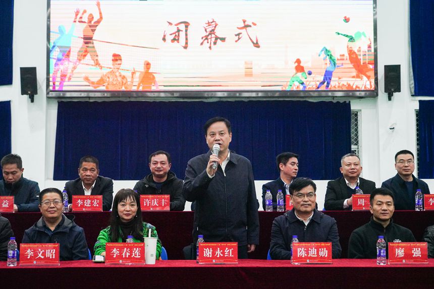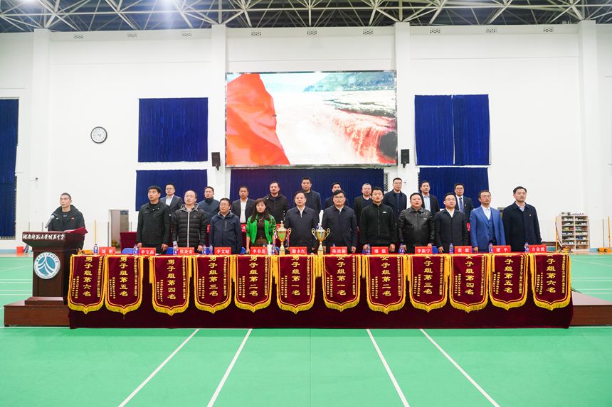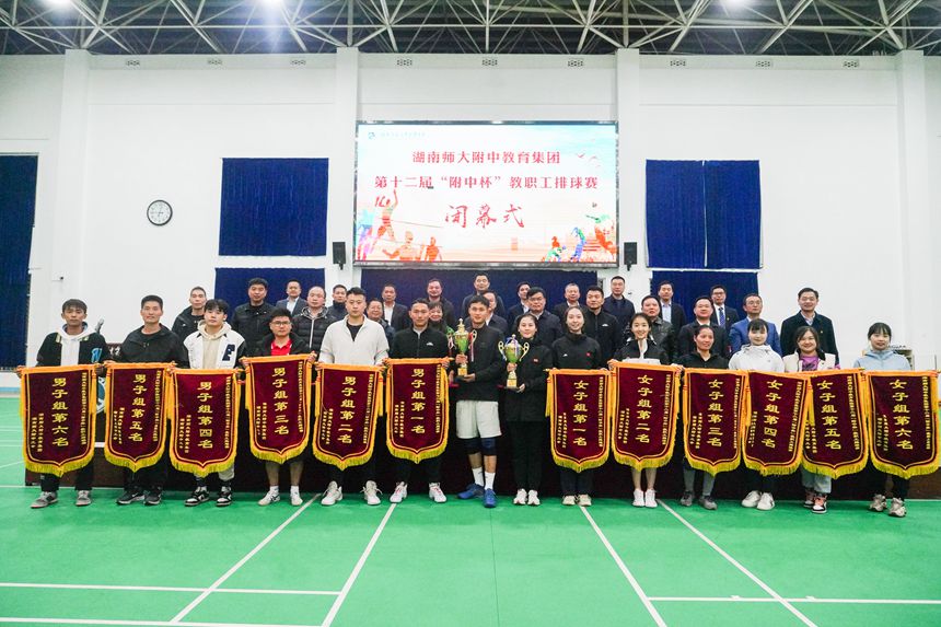 11月17日晚20:30,闭幕式如期举行。校长谢永红,副校长兼工会主席陈迪勋,纪检书记李春莲,副校长苏建祥,党委委员廖强,各集团校、友好校党组织书记及裁判长申宝磊等出席。仪式由工会体育委员汤彬主持。工会副主席伏炎安作比赛总结,他介绍本届比赛累计80场次,具有领导高度重视、组织严密充分、比赛精彩纷呈等三大特点。裁判长申宝磊宣布比赛成绩,男子团体前六名分别为湖南师大附中、湖南师大附中博才实验中学、湖南师大附中雨花学校、长沙市华益中学、湖南师大附中梅溪湖中学、湖南师大附中高新实验中学,女子团体前六名依次是湖南师大附中、湖南师大附中博才实验中学、湖南师大附中星城实验学校、湖南师大附中梅溪湖中学、长沙市华益中学、湖南师大附中星沙实验学校。随后,谢永红校长向男女冠军队授奖杯,校领导向男女队前六名授锦旗。谢永红宣布湖南师大附中教育集团第十二届“附中杯”教职工排球赛圆满闭幕。