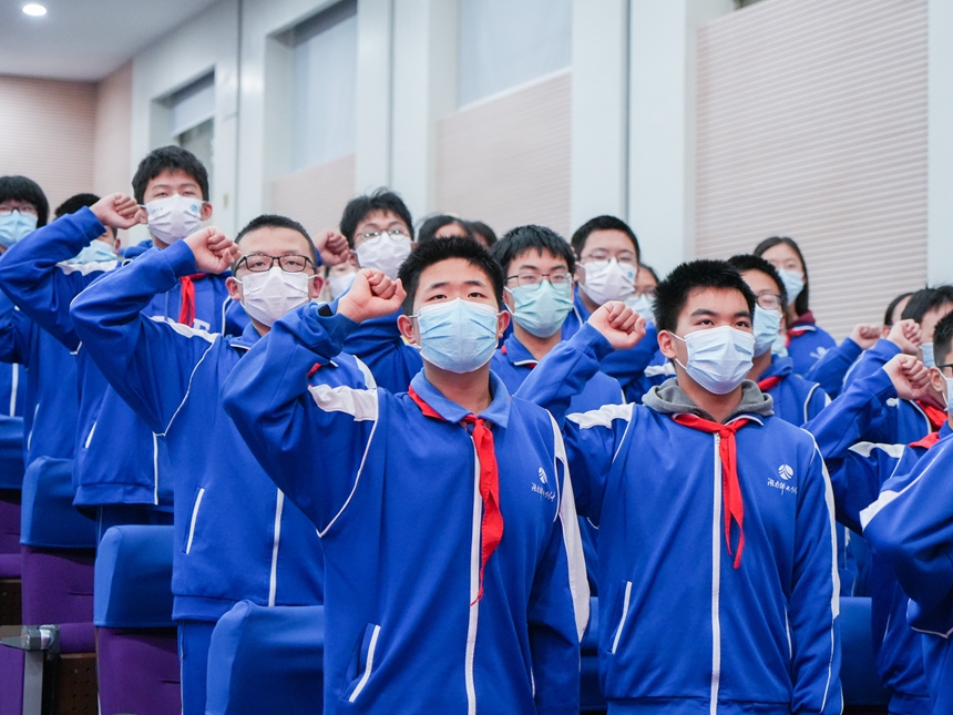 伴随着铿锵有力的音乐声,三名旗手挺胸抬头、踏着正步走过队伍。随后,同学们再一次唱起队歌、重温入队誓词。