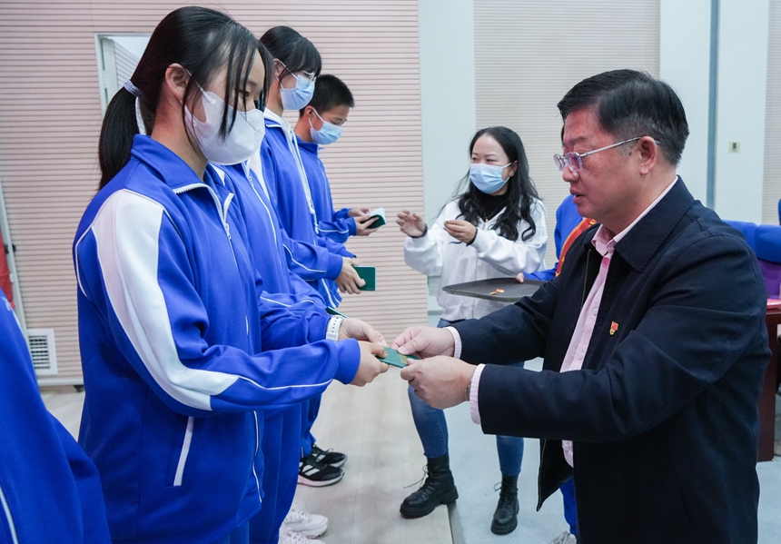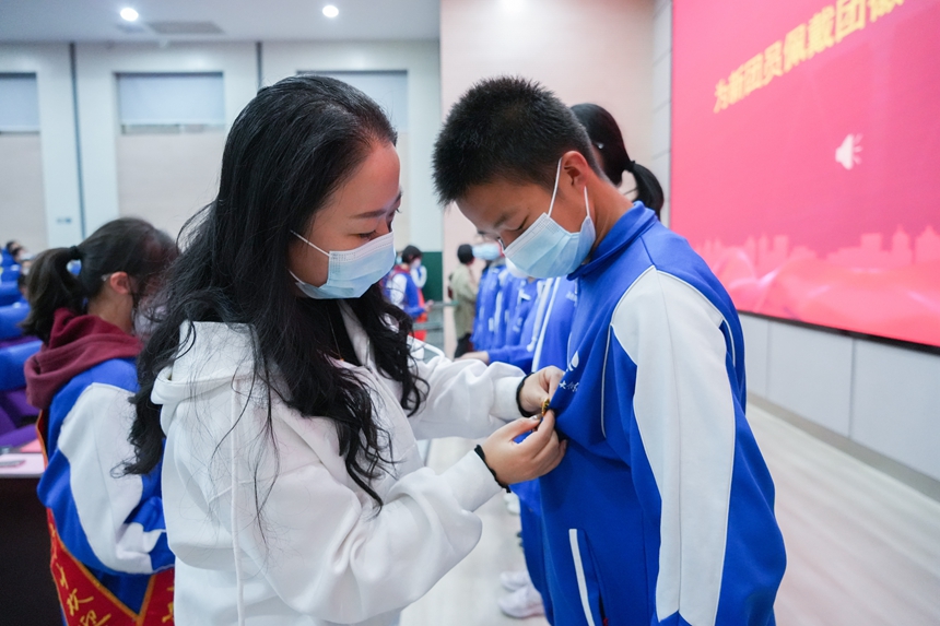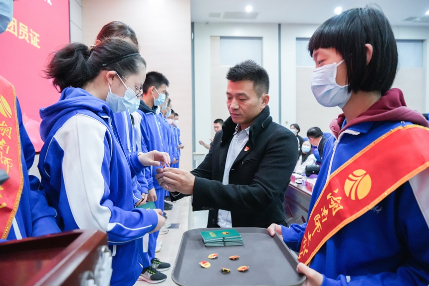廖强宣读团总支、各团支部成立的决定以及九年级团员名单。与会领导、老师为24名新团员颁发团员证、佩戴团徽。