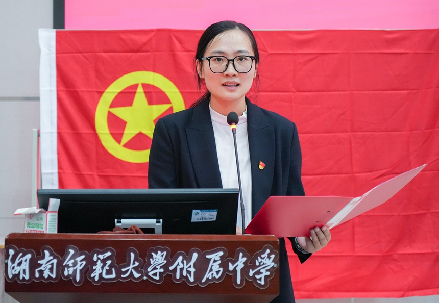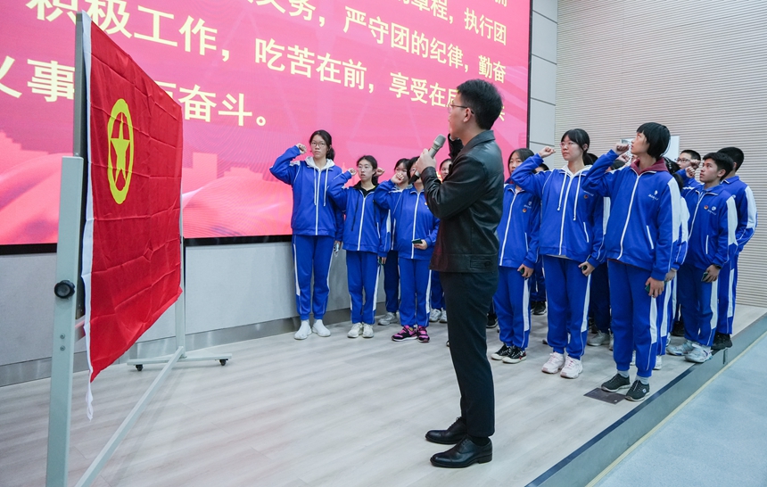 在教工团支部副书记邓卓扬的带领下,新团员面对团旗,举起右手庄严宣誓,光荣地加入了中国共产主义青年团。