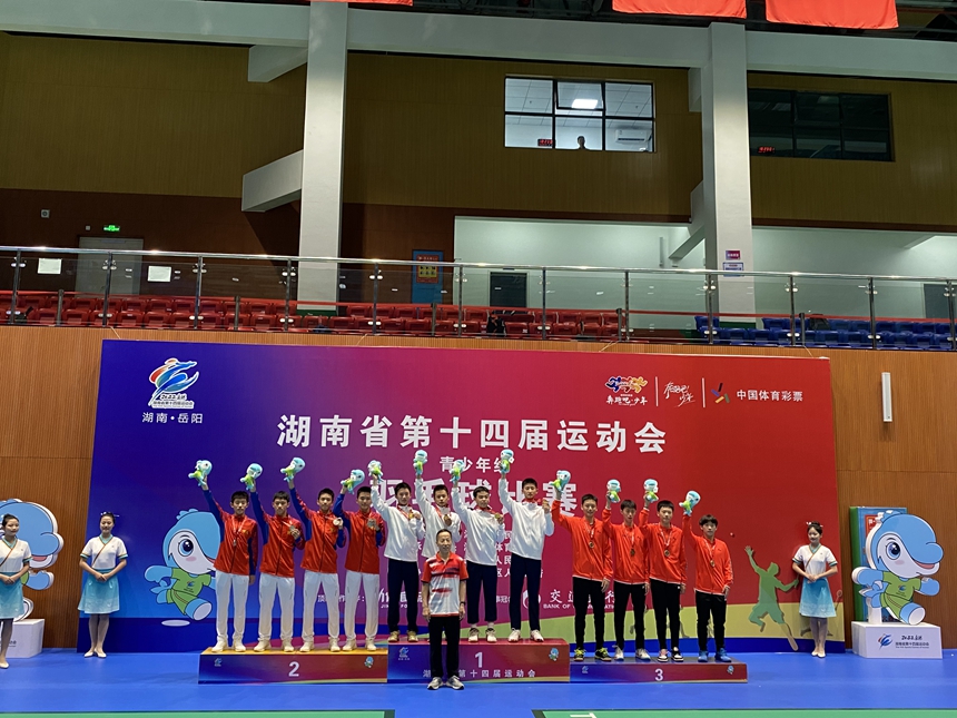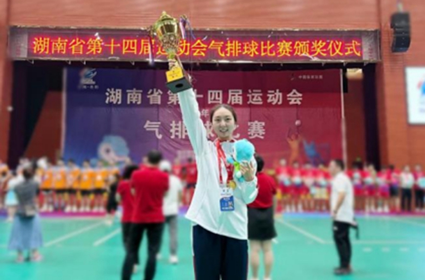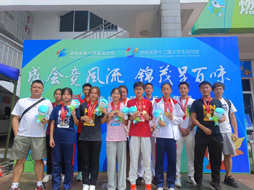 经过一个多月的激烈角逐,湖南省第十四届运动会于9月18日在岳阳落下帷幕,长沙、岳阳、衡阳代表团分获奖牌前三名。我校派出多位健儿参与田径、羽毛球、乒乓球、击剑、气排球等几个大项的比赛,共获得15金9银8铜的佳绩,其中田径代表队获得7金5银5铜,乒乓球代表队获得3金3银1铜,羽毛球队获得2金1银2铜,击剑获得1金,气排球获得2金。比赛期间,校长谢永红、党委委员廖强、体育美育中心主任谭伟前往赛场观看比赛,并为我校运动员和教练员们加油。