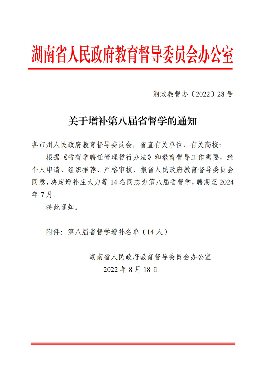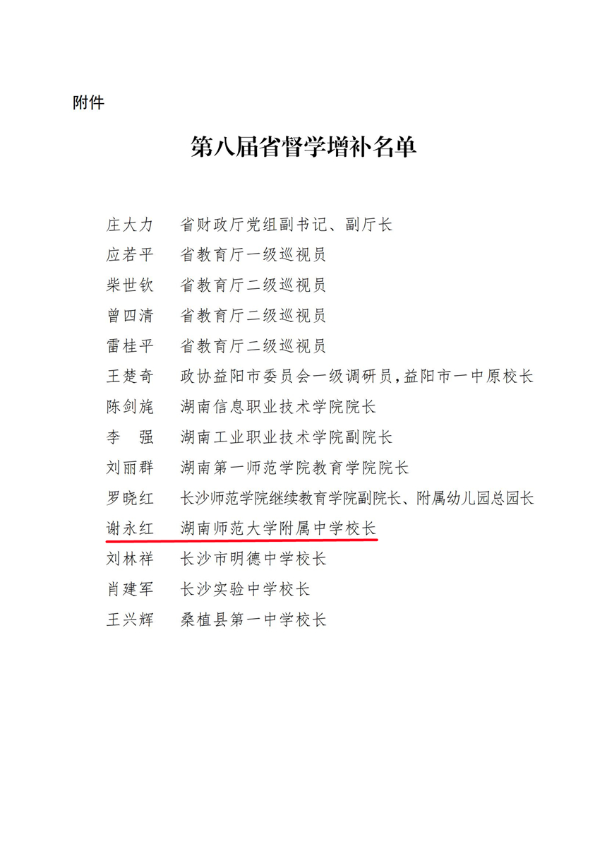 近日,湖南省人民政府教育督导委员会办公室下发《关于增补第八届省督学的通知》,我校校长谢永红被聘为第八届省督学。