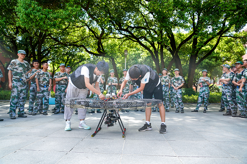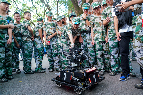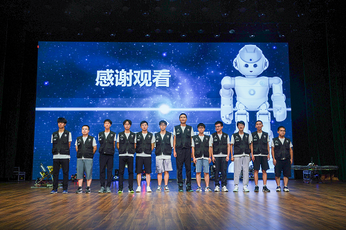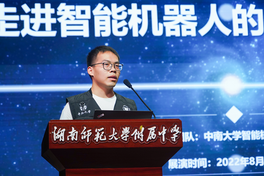 中南大学智能机器人研发团队队长林鹏飞及队员们依次给同学们进行机器人展演、科普机器人原理知识、制作过程。
