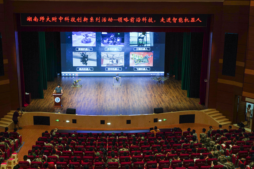 8月21日下午,学校在学生活动中心开展“领略前沿科技,走进智能机器人”科技创新活动,活动邀请了中南大学智能机器人研发团队为高一新生普及前沿科技知识和展演各色机器人。会议由科技创新中心副主任李湘黔主持,参加会议的有高一年级主任马正阳、副主任姜平贵、全体教官、全体班主任和高一年级全体学生。