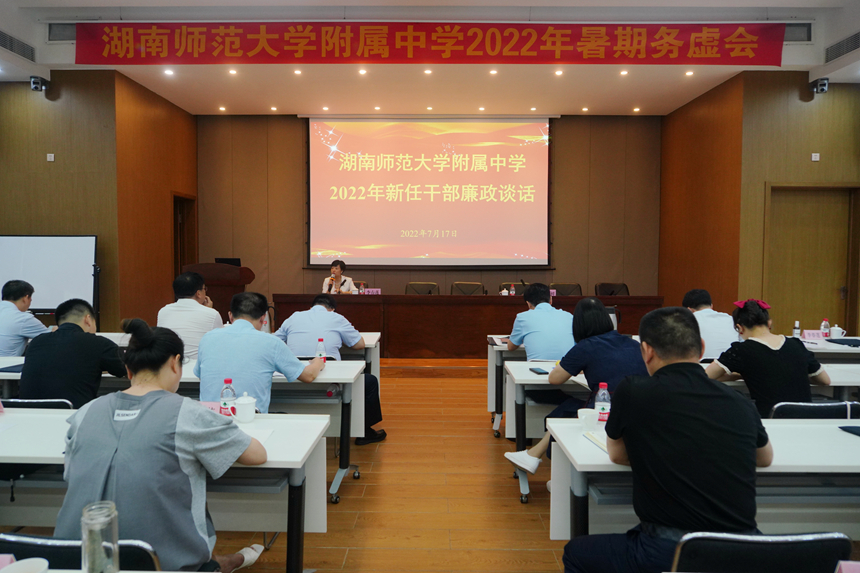 7月17日,学校召开2022年新任干部集体廉政谈话。纪检书记李春莲,主持会议,学校党委、行政领导班子成员、集团校校长、各部门负责人、年级主任等参加会议。