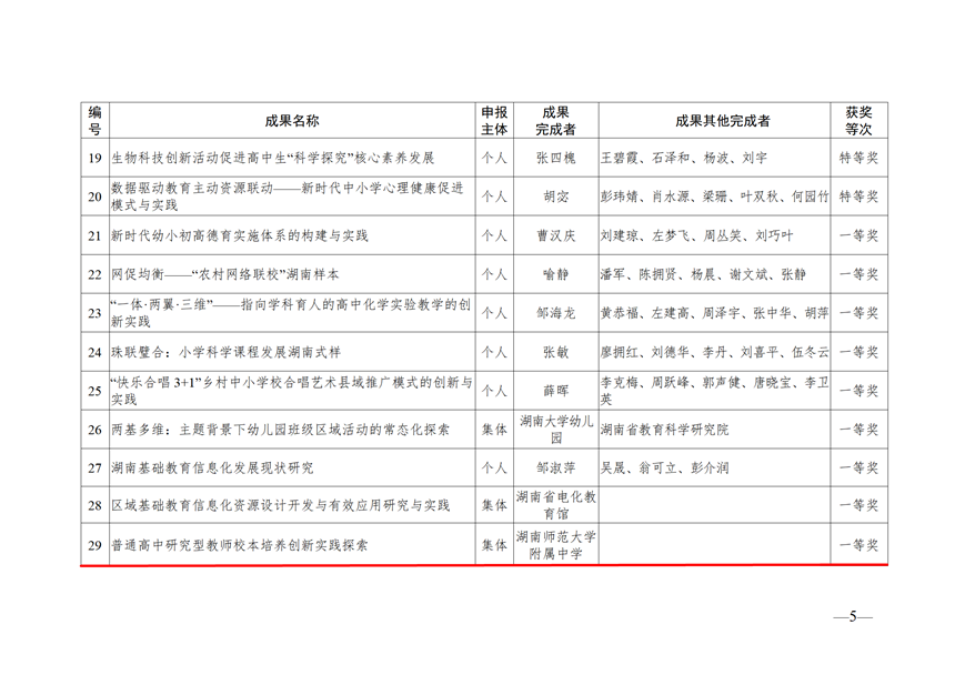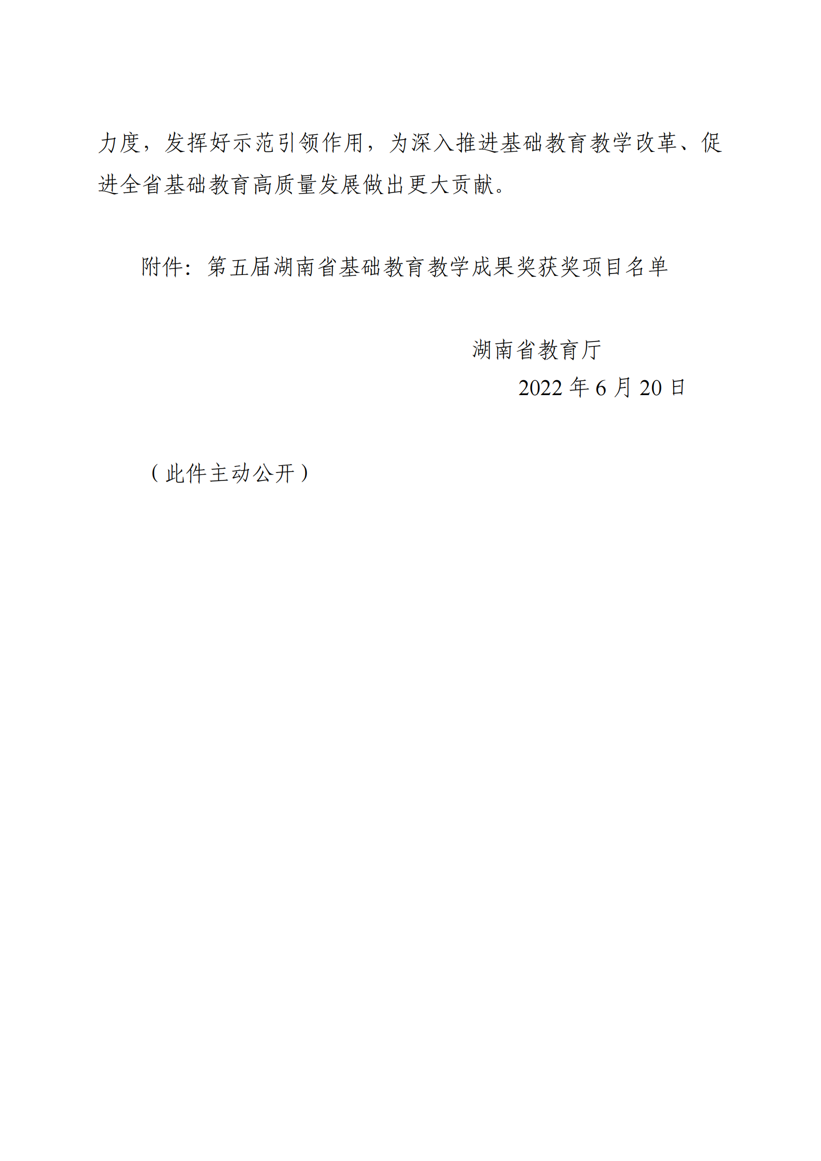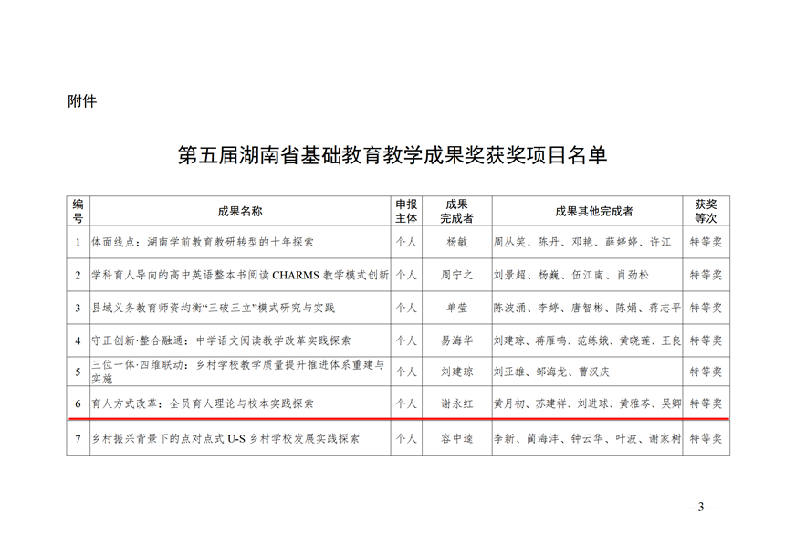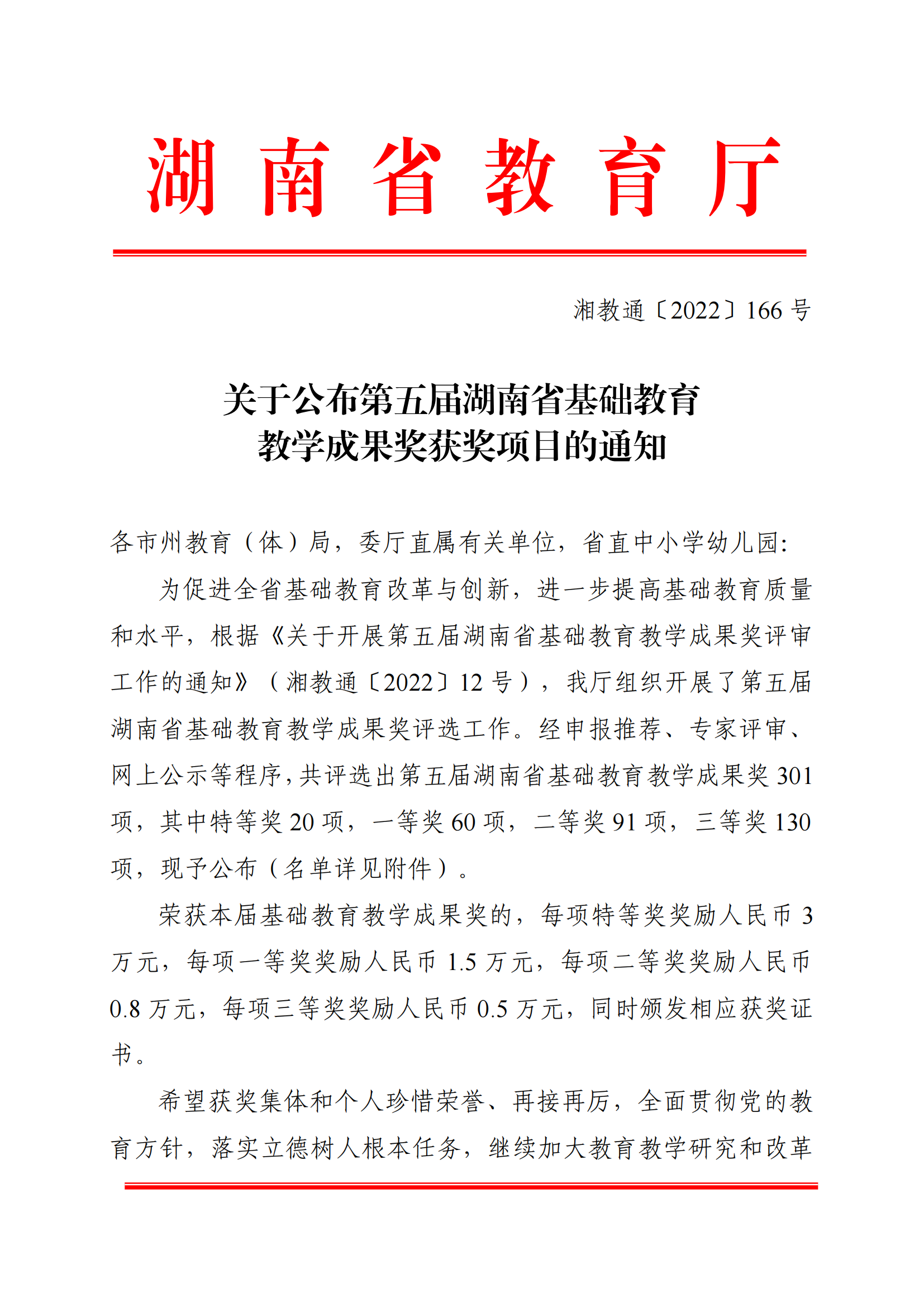 6月20日,湖南省教育厅下发《关于公布第五届湖南省基础教育教学成果奖获奖项目的通知》(湘教通〔2022〕166号)文件,我校申报的《育人方式改革:全员育人理论与校本实践探索》和《普通高中研究型教师校本培养创新实践探索》两项成果,分别荣获第五届湖南省基础教育教学成果奖特等奖和一等奖,我校获奖数量和等第均居全省中小学校首位。