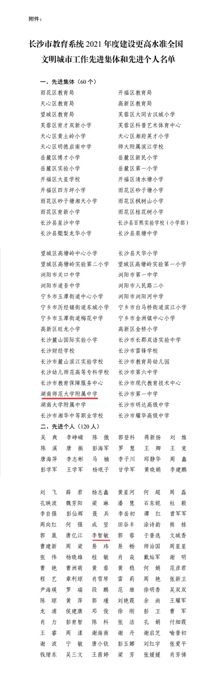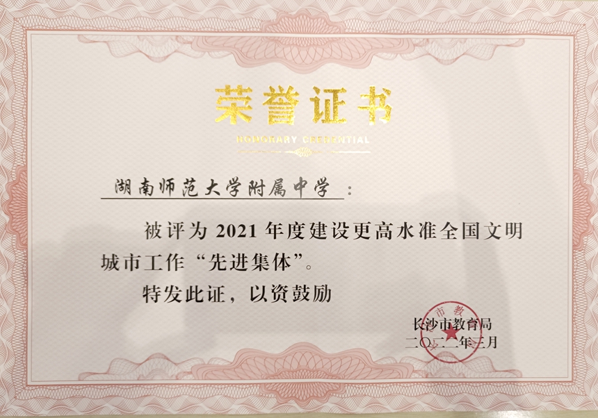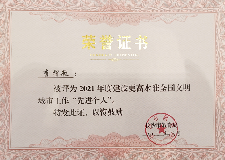 近日,长沙市教育局公布《关于2021年度文明创建工作考核结果的通报》,我校获评2021年度建设更高水准全国文明城市工作“先进集体”,后勤与保卫处主任李智敏获评2021年度建设更高水准全国文明城市工作“先进个人”。