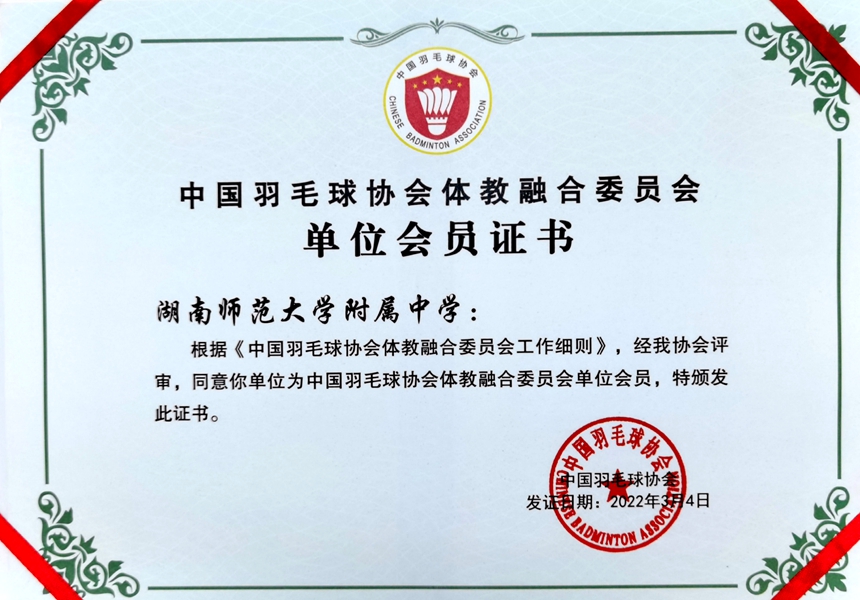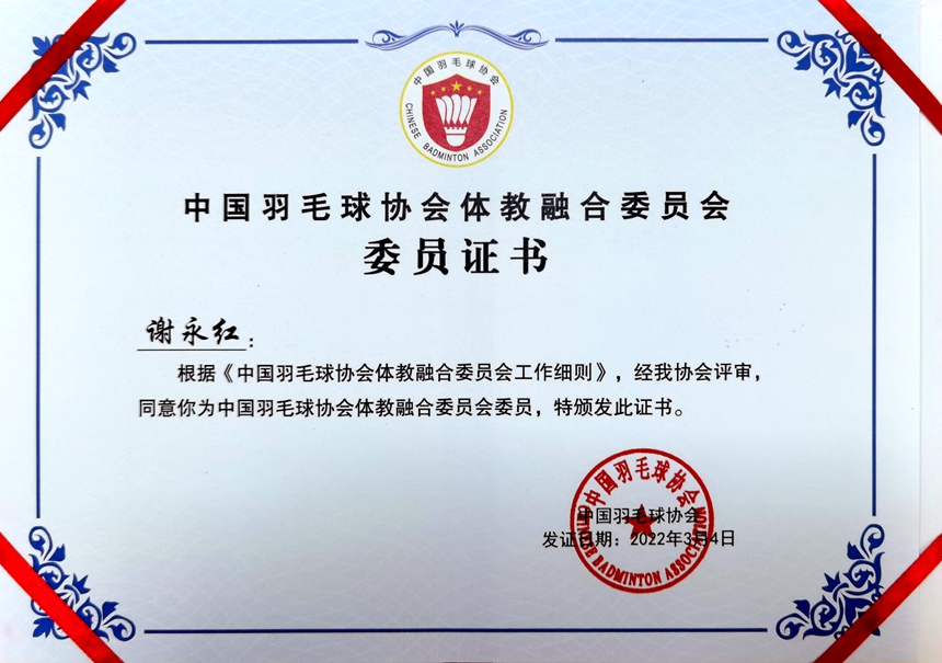 日前,中国羽毛球协会发文通知,我校当选为中国羽毛球协会体教融合委员会单位会员,同时,我校校长谢永红当选为中国羽毛球协会体教融合委员会委员。