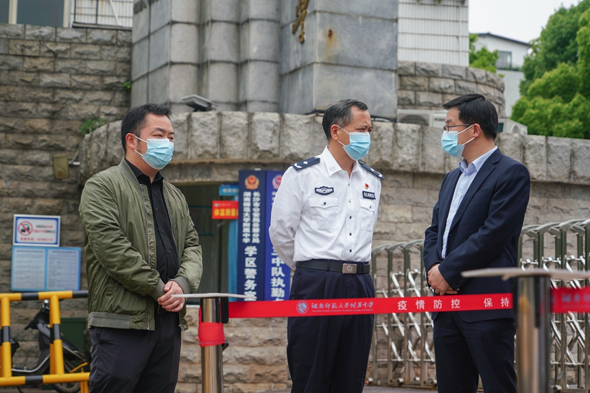 4月22日上午,长沙市岳麓区公安分局政委、学校法治副校长刘志敏、桔子洲派出所所长陈最光、教导员曾媛来校指导平安校园建设工作。
