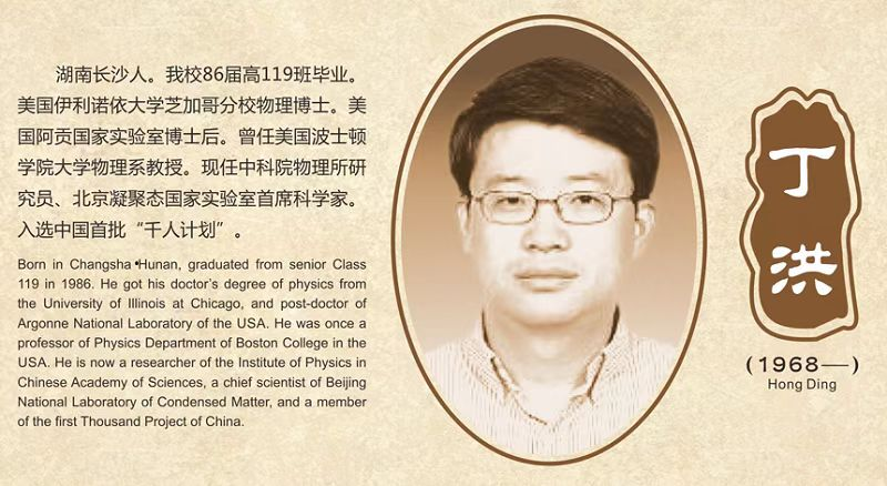 丁洪,中国科学院物理研究所研究员,北京凝聚态物理国家实验室常务副主任、首席科学家,湖南师大附中86届毕业生。长期从事凝聚态物理的实验研究,主要研究领域为量子材料和量子计算,取得了多个具有重大国际影响力的开创性成果。学术成果于2015年、2017年、2018年入选中国科学十大进展/中国十大科技进展新闻。在科学期刊上发表了280多篇学术论文,其中 《Nature》/《Science》正刊11篇、子刊24篇。1999年获美国的斯隆奖,2005年获中国国家杰出青年基金B类,2010年获中国侨界“创新人才”贡献奖,2011年被选为美国物理学会会士, 2018年获欧洲先进材料奖,2018年入选CCTV年度科技创新人物,2020年获中科院杰出科技成就奖(个人奖)。