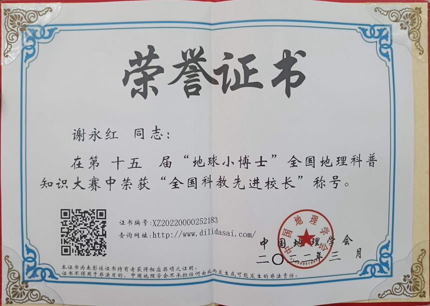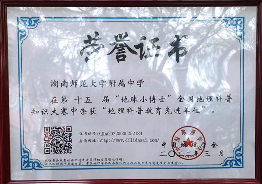 在第十五届“地球小博士”全国地理科普知识大赛中,我校取得了丰硕的成绩:全国一等奖41人、全国二等奖34人、全国三等奖35人,获奖人数位于全国前列。湖南师大附中荣获“地理科普教育先进单位”奖,校长谢永红荣获“全国科教先进校长”称号,杨帆、彭建锋、陈克剑、宋泽艳、肖雨琳、陈媛、罗梓维、张琳、陈柳逸等老师荣获指导教师一等奖,并被授予“全国优秀科技辅导员”称号。
