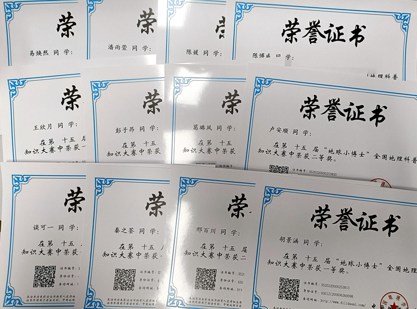 全国三等奖:张壹鸣、骆文萱、熊艺璇、周子丰、刘宸宇、唐培浩、李翼帆、方怡、李心诺、刘宇航、周雨君、吴明杰、周思源、周源婵、王鑫钰、刘佳程、邓雅丹、陈飞宇、甘晓霖、彭丞鑫、稂斯晨、王雅睿、刘昊、王嘉璐、李有、尹伊、郭一鸣、石一乐文、彭煦宁、肖轶品、胡湘睿、刘紫嫣、方熙娜、钦润东、周昱成。