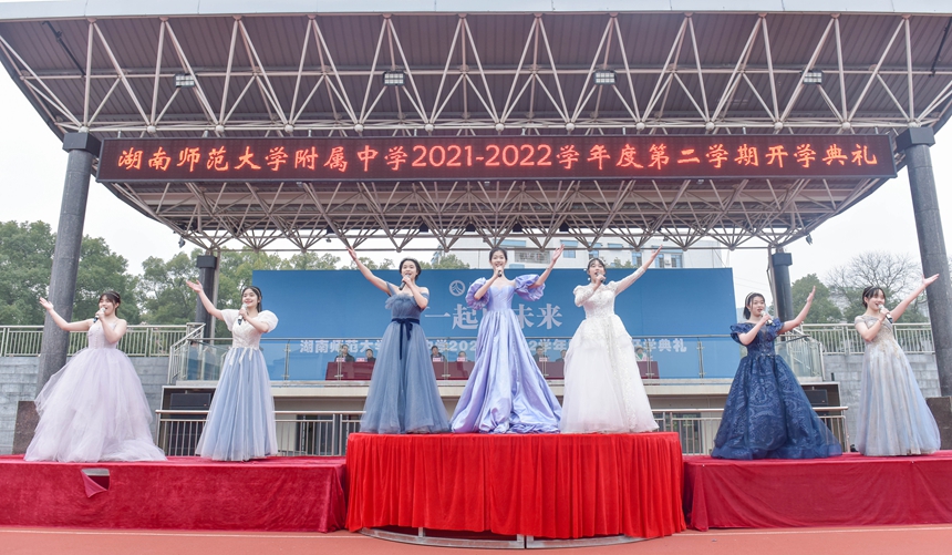 在全场齐声高唱国歌、校歌后,苏建祥作题为《戮力同心,勇攀高峰,一起向未来》的新学期致辞。他代表学校向全体师生致以新年的美好祝愿。随后,他从校园建设、人才培养成果、学校改革发展三个方面串联起过去一年全体附中人奋斗的成绩单。他勉励大家心怀国之大者,脚踏三湘四水,与家国同频共振;牢记使命担当,共铸附中辉煌,附中人奋发有为;弘扬仁爱之心,争取政府支持,家校社协同育人,一起向未来。新的一年展现虎虎生威的雄风、生龙活虎的干劲和气吞万里如虎的精神,戮力同心,勇攀高峰,一起创造更加美好的未来。