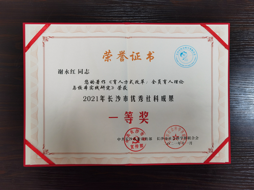会议通报并表彰了长沙市第二十一届哲学社会科学优秀成果。谢永红教育专著《育人方式改革:全员育人理论与校本实践研究》荣获著作类一等奖。