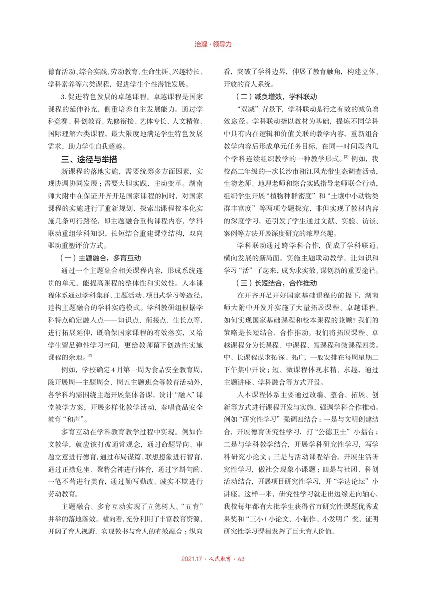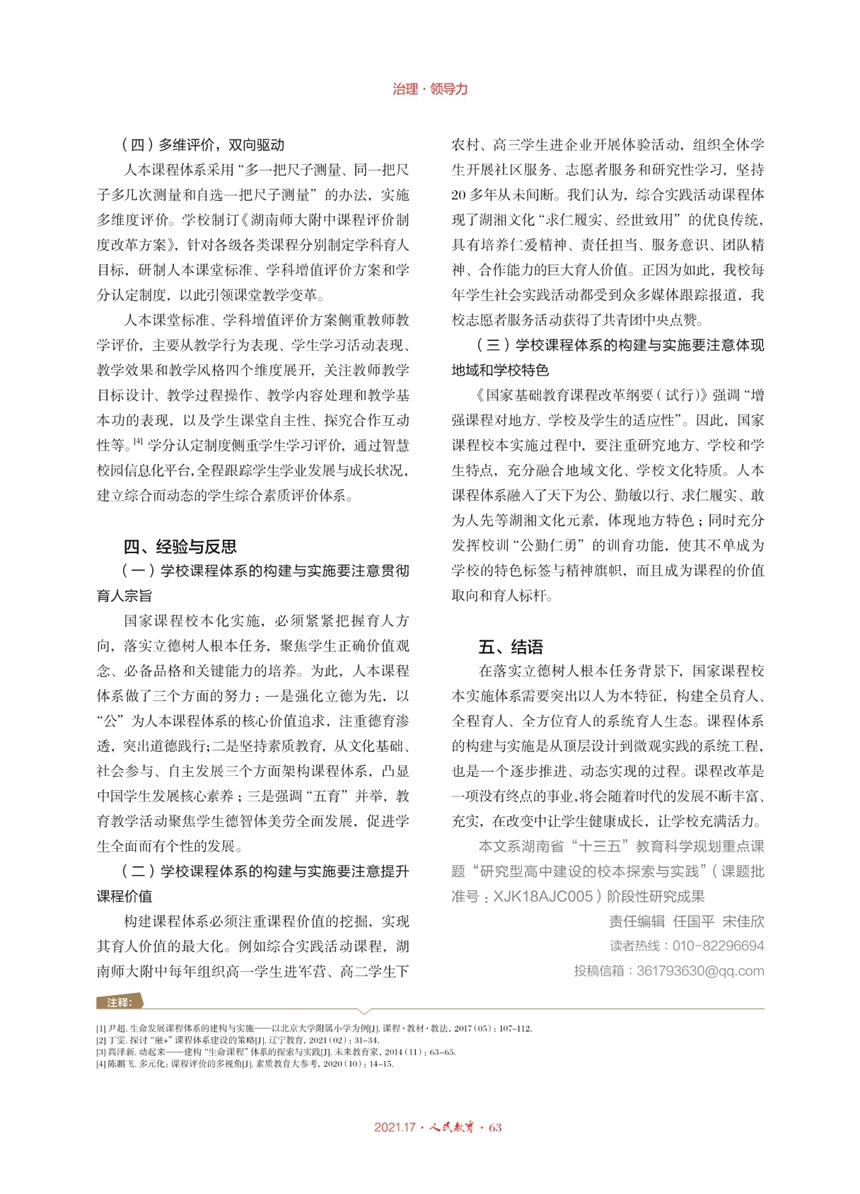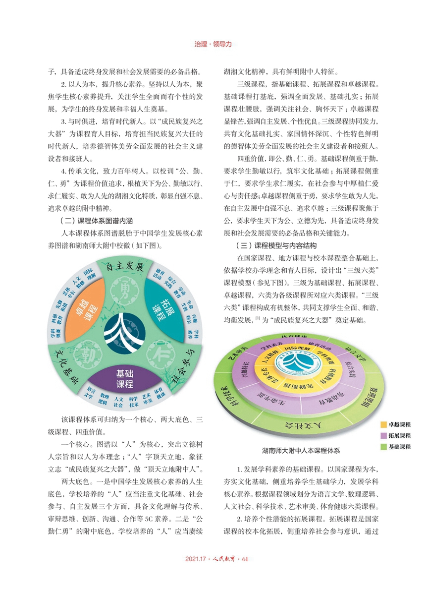 《以校为本构建基于立德树人根本任务的课程体系——湖南师范大学附属中学构建人本课程体系探索》刊发于《人民教育》“治理·领导力”专栏。文章从背景与理念、内涵与结构、途径与举措、经验与反思等多个维度,全面推介了人本课程体系,特别是充分突出了基于立德树人、坚持以人为本、聚焦学生核心素养全面发展、凸显地域和学校文化特质等课程建构特色。这篇文章,是我校课程建设和育人方式改革的重大成果,也是湖南省“十三五”教育科学规划重点课题“研究型高中建设的校本探索与实践”(课题批准号XJK18AJC005)阶段性成果。