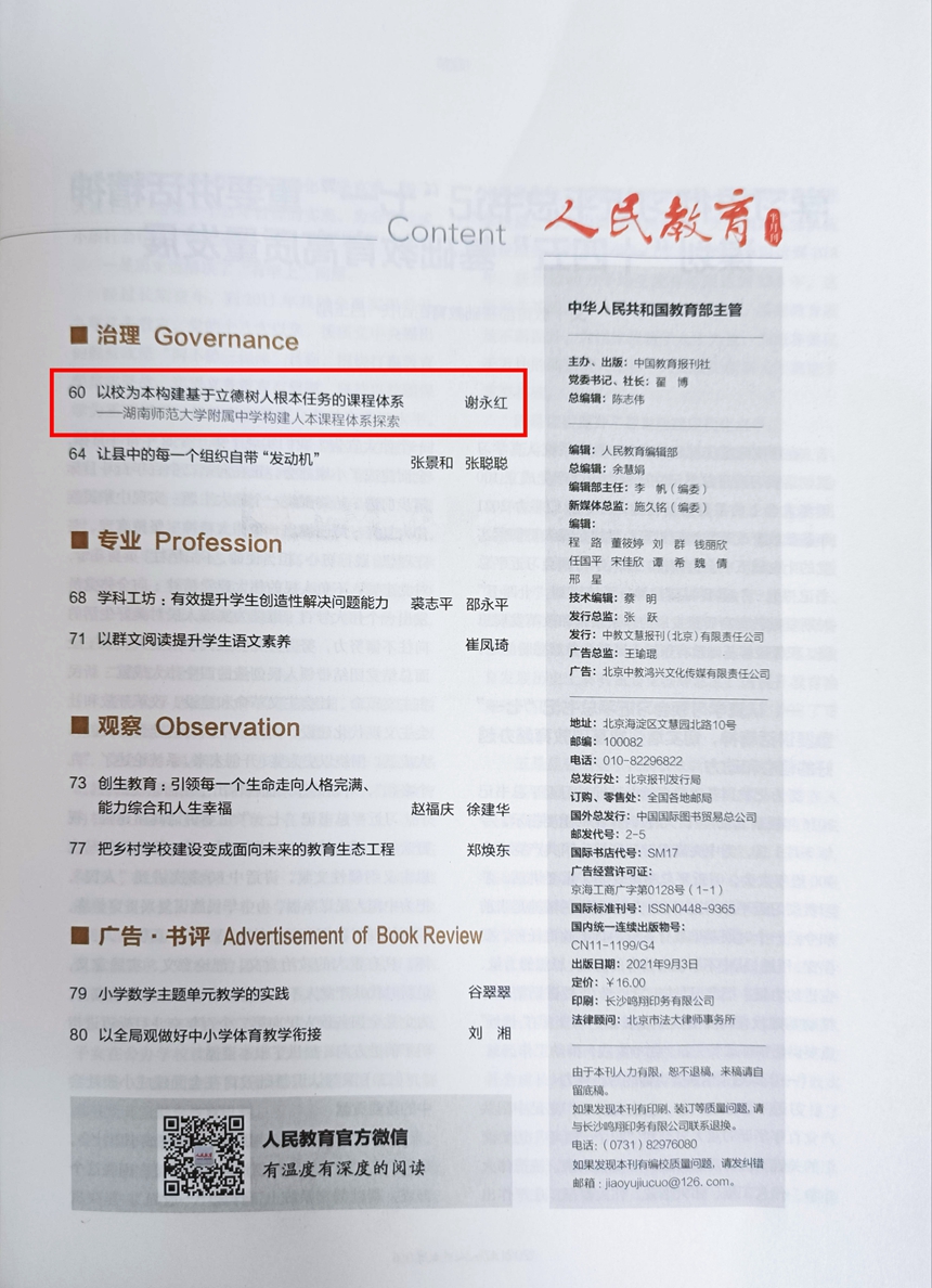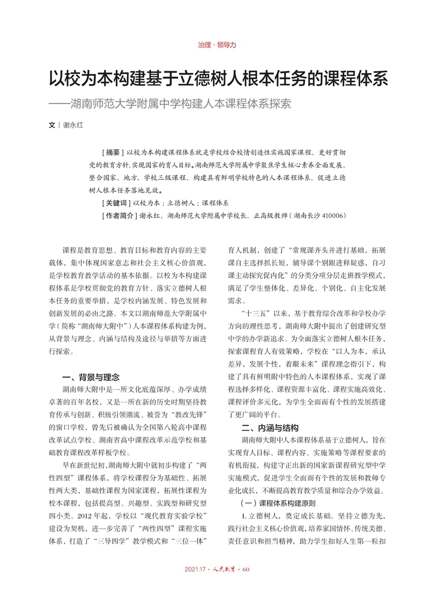 《人民教育》2021年第17期(总第855期)刊发谢永红校长《以校为本构建基于立德树人根本任务的课程体系——湖南师范大学附属中学构建人本课程体系探索》一文,专题推介我校人本课程体系。