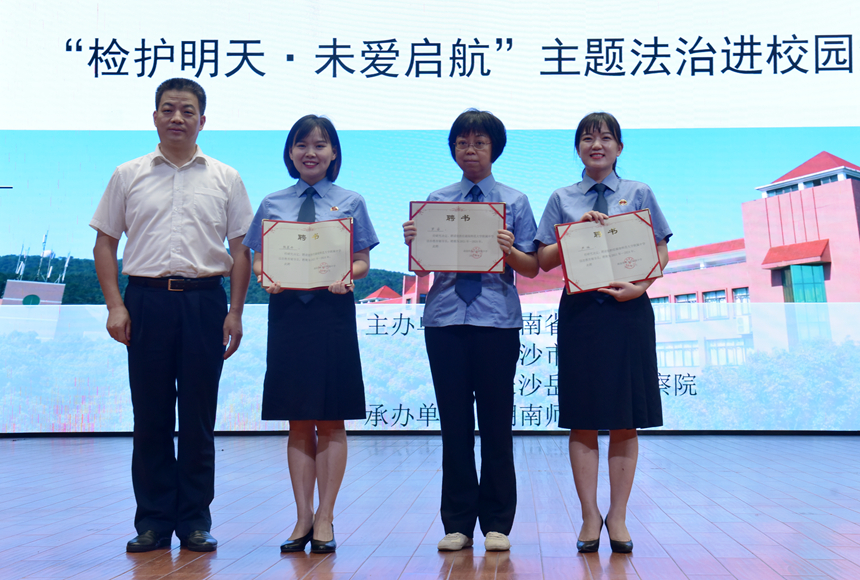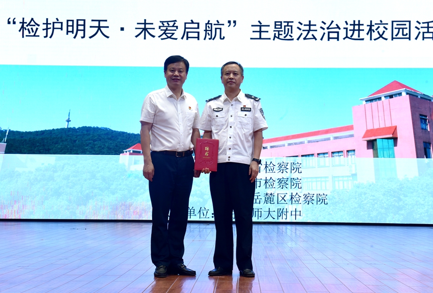 首先举行的是法治副校长聘任仪式,谢永红为刘志敏颁发法治副校长聘书,聘期三年。苏建祥为长沙市检察院严琳、罗姿,岳麓区检察院周萃、熊晨卉颁发法治辅导员的聘任证书,聘期三年。