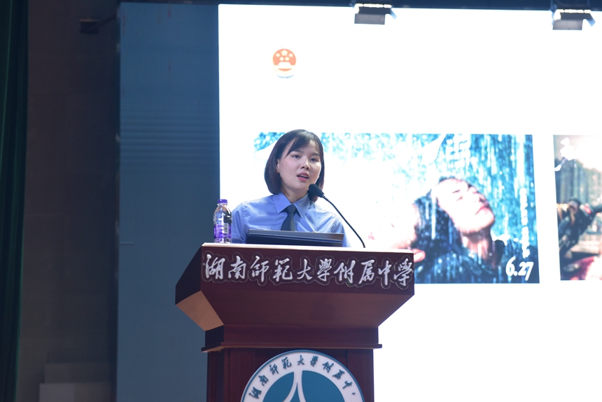公安系统的岳麓区公安分局政委刘志敏、岳麓区公安分局驻湖南师大附中民警罗命华,检察系统的省检察院第九检察部三级高级检察官助理周雪强、长沙市检察院第四检察部主任严琳、副主任罗姿,岳麓区检察院第一检察部熊晨卉,湖南师大附中校长谢永红、副校长苏建祥、团委书记兼德育与学生发展处副主任李钊、团委副书记兼大队辅导员温宇出席活动。活动由德育与学生发展处主任吴卿主持。