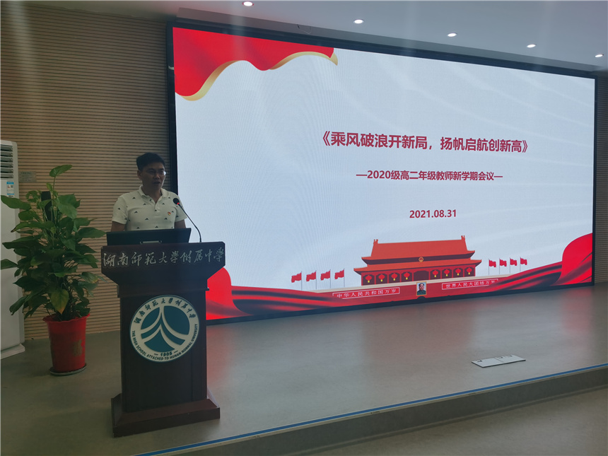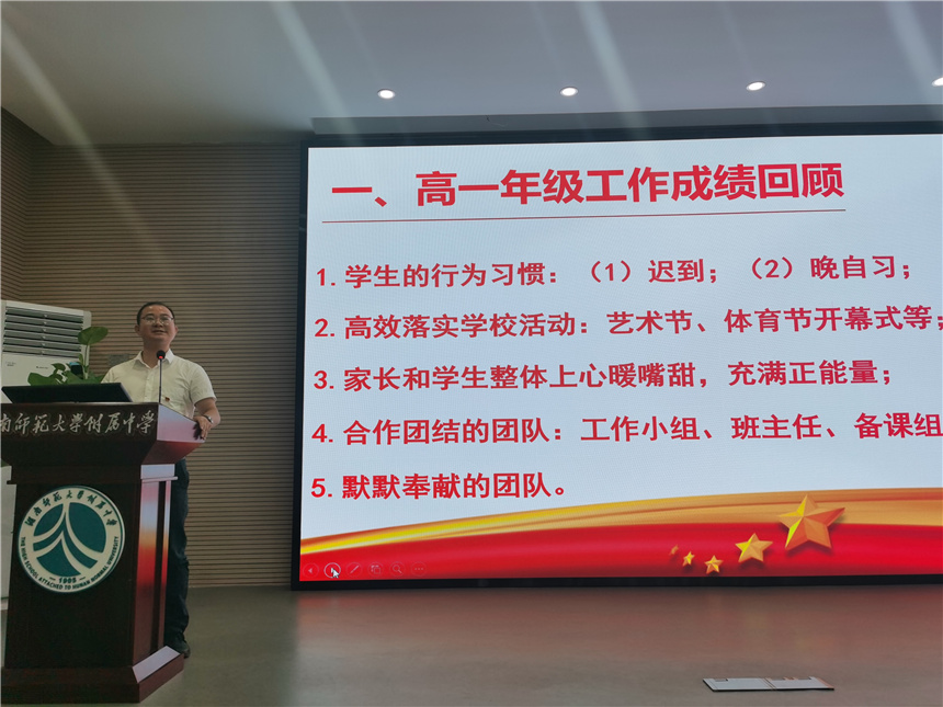会议进行到第二部分,王建总结了高一年级工作取得的成绩,从行为习惯养成、活动组织开展、团队精诚合作等方面进行了回顾,充分肯定每一个老师的付出,肯定团队的智慧与力量,并对存在的个别问题提出改进举措。接下来,王建老师重点部署新学年工作,分别从推进高效教育教学研究、落实过程性学习检测、注重创新型人才培育、加强人本型年级管理四个方面进行具体部署,工作重点明确,路径清晰。
