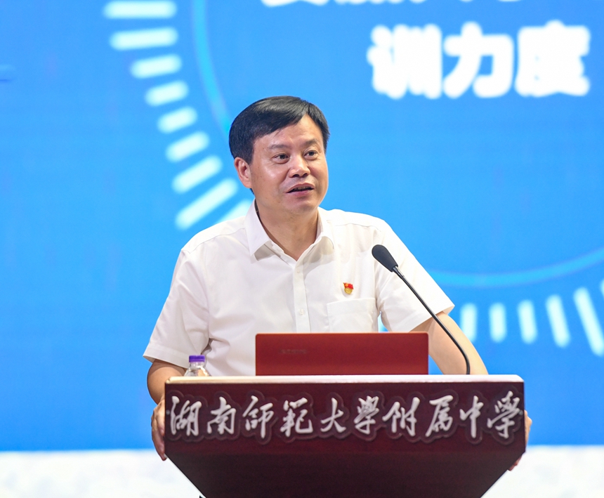 第三部分为新学年工作要点。他结合当前教育形势和学校发展现状、愿景目标,主要强调了五个方面的重要工作:狠抓“双减”政策落实,促进学生身心健康成长;狠抓师德师风建设,净化校园教育生态环境;狠抓学校课程建设,推动人本课程落地实施;狠抓课堂教学研究,提升课堂教学质量水平;狠抓教师队伍建设,助力青年教师快速成长。
