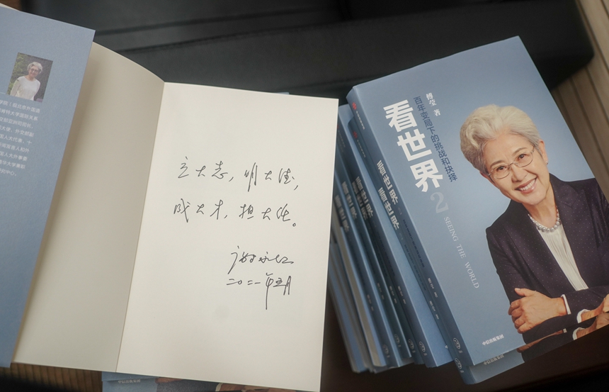 谢校长向每位与会代表赠送了前外交部副部长傅莹所著的《看世界》一书,并在扉页题写了习近平总书记在清华大学考察时寄语青年的期望:立大志、明大德、成大才、担大任。
