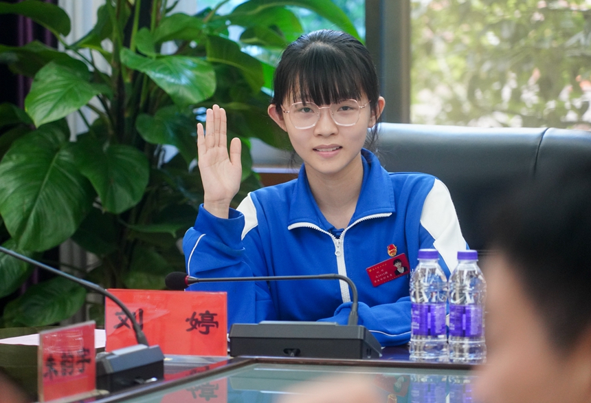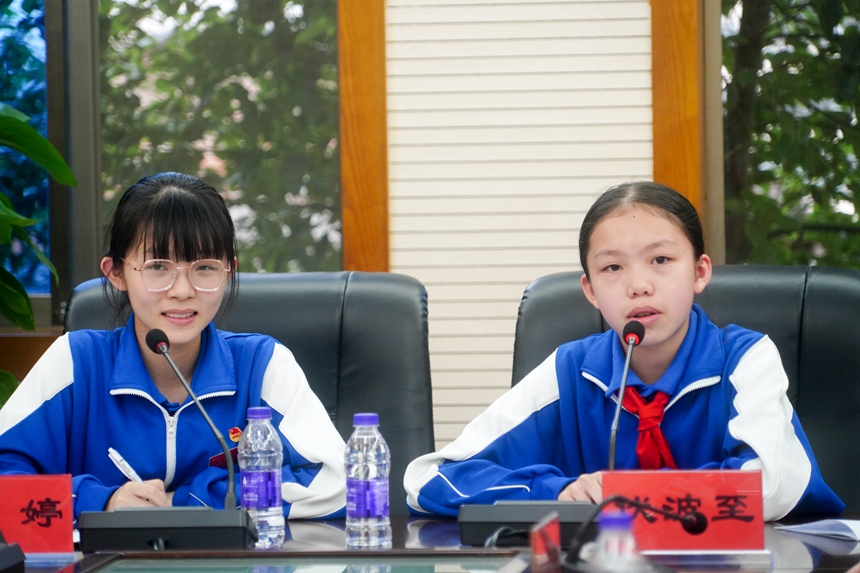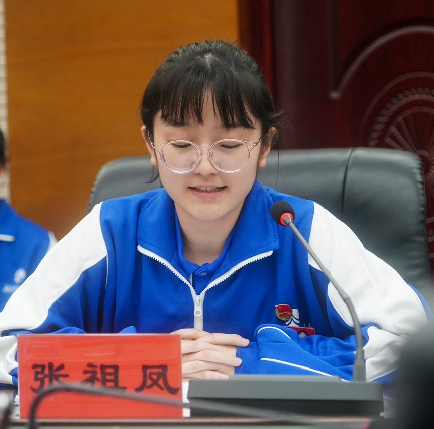本次座谈会以“看世界·勇担当”为主题,旨在展示在百年未有之大变局下,附中学子的思考与担当。五位学生代表张祖凤、雷承睿、杨乐言、杨熹之、向思瑾分别从全球化趋势、讲好中国故事、科技强国、世界和平与发展、国际关系等方面作主题发言。铿锵的话语展现了附中人的责任与担当。