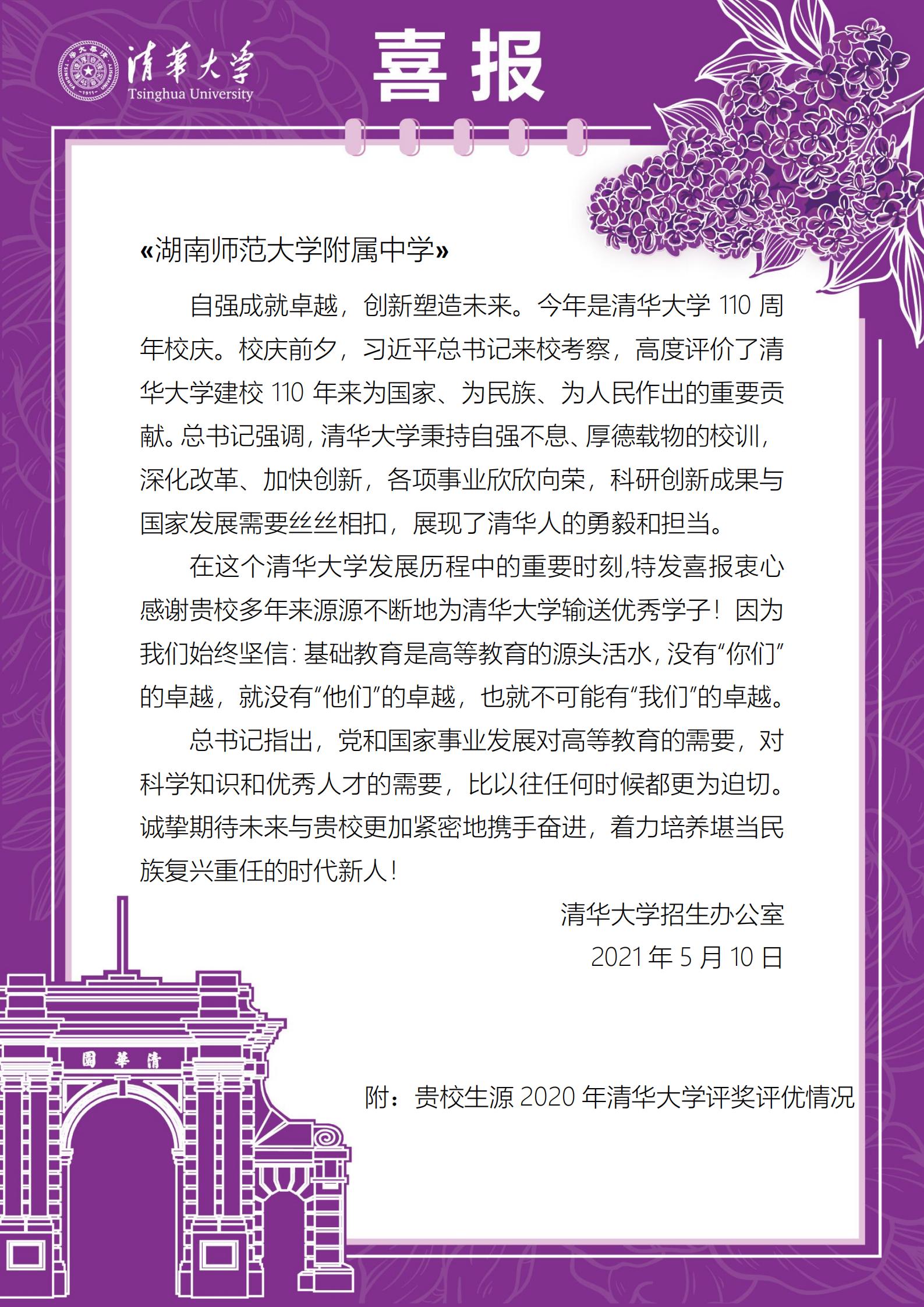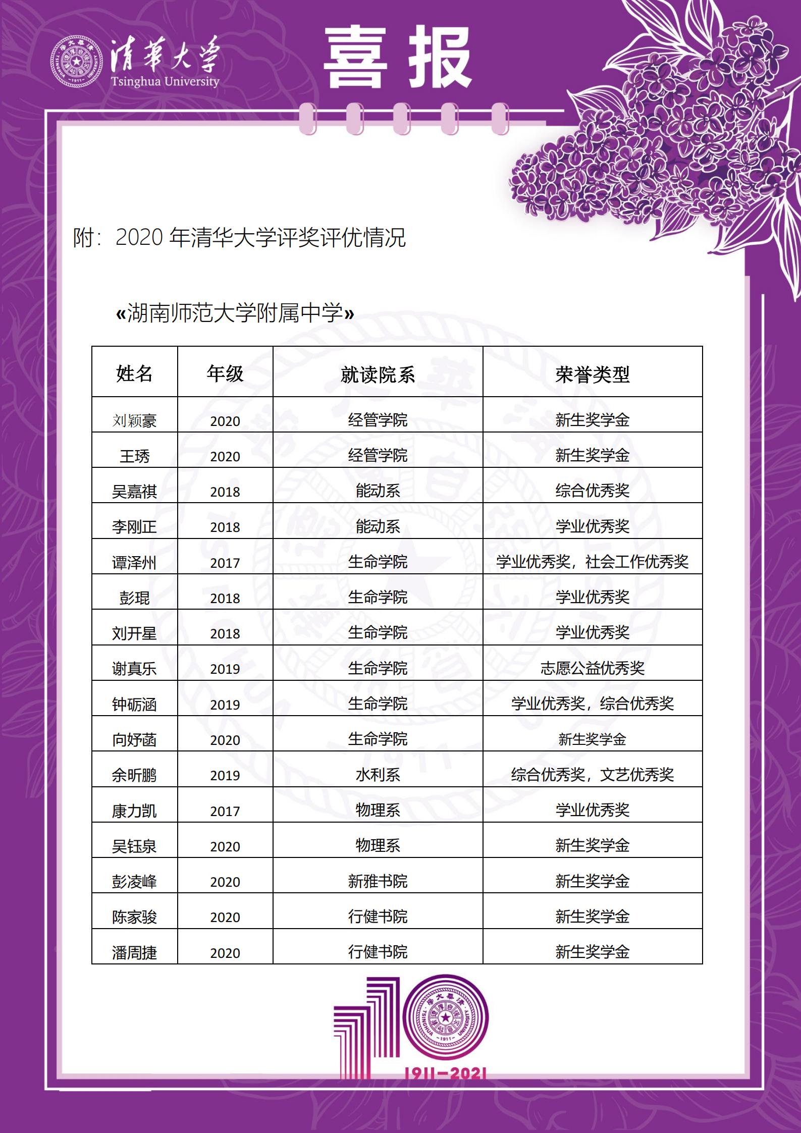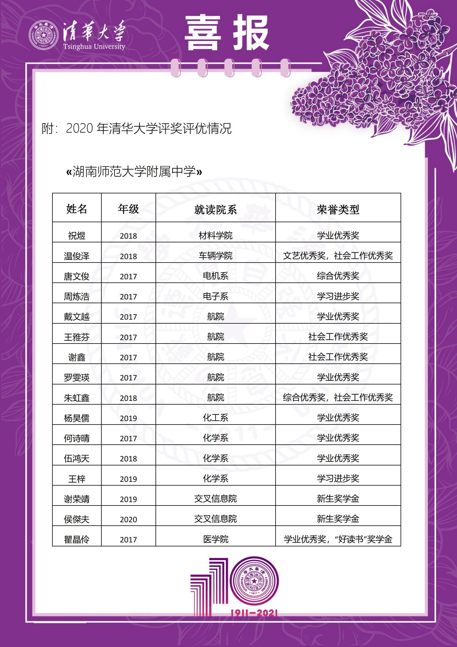 近日,清华大学向我校附属中学发来喜报,对我校多年来一直为清华大学输送优质生源表示衷心感谢,对附中学子在清华的优异表现表示热烈祝贺。在2020年清华大学评优评奖工作中,我校多名校友光荣上榜。