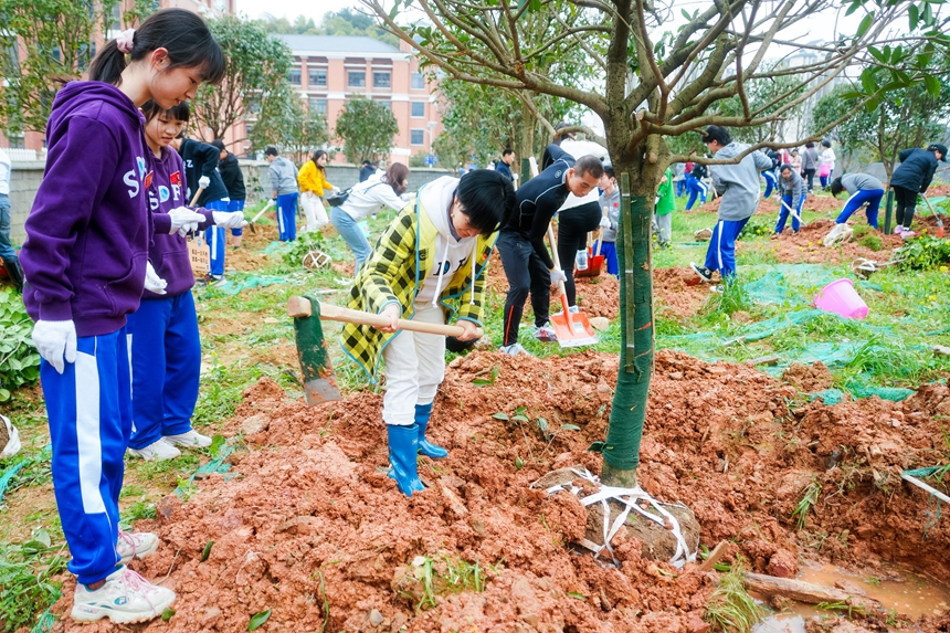 校长谢永红介绍:“多年来,学校认真落实‘立德树人’根本任务,结合学校教育教学实际,主动开展中学生义务植树等生态文明教育活动,在实践中培养学生的劳动精神,树立绿色发展理念。”