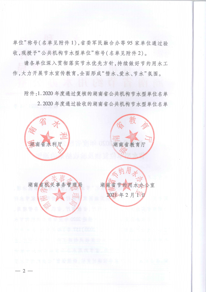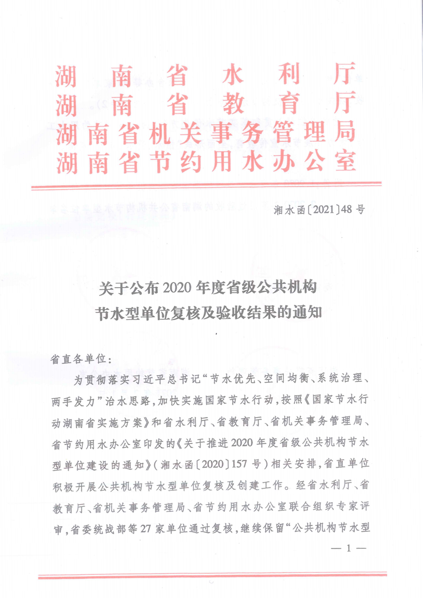 近日,经省水利厅、省教育厅、省机关事务管理局、省节约用水办公室联合组织专家评审,我校通过验收,被授予“公共机构节水型单位”称号。 多年来,我校深入贯彻落实节水优先方针,持续做好节约用水工作,大力开展了节水宣传教育,全面形成了“惜水、爱水、节水”氛围。
